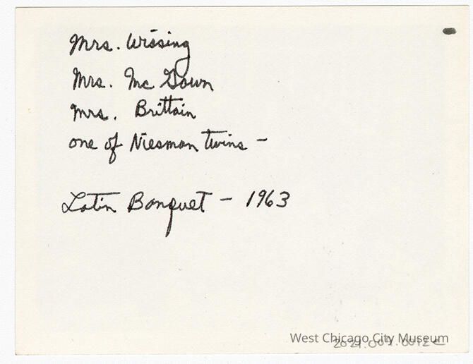 e - Photograph, black and white, showing 3 woman and a teenage girl seated on the floor at a low table, wearing togas over their clothes. Behind them is a painting of a Roman Colonnade hung on a brick wall. Back reads "Mrs. Wissing, Mrs. McGown [sic Mc Gawn], Mrs. Brittain, one of the Niesman twins, Latin Banquet 1963" [Either Donna or Diane Niesman, who look to be identical twins]