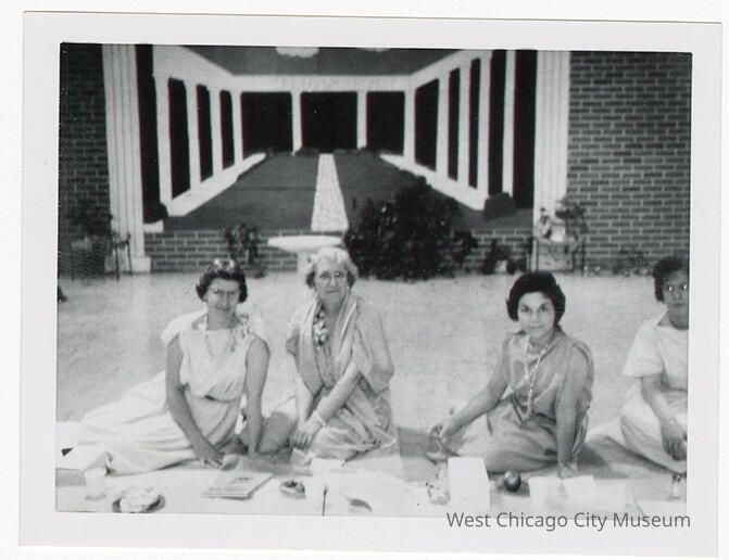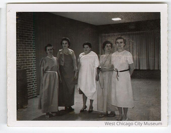 i - Photograph, showing 5 adult women in various draped, toga like outfits. back reads "Mrs. Jahns, Mrs. Pinzke, ___, ___, Jeanette Anderson 1963"Photograph Details