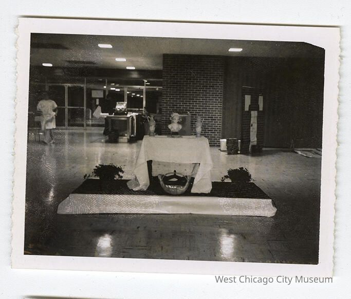 f - Photograph, black and white, shows an altar like table with a bust and two vases on a very short platform. There is a person walking to the background left, and there is a brick wall and big windows with a door behind.