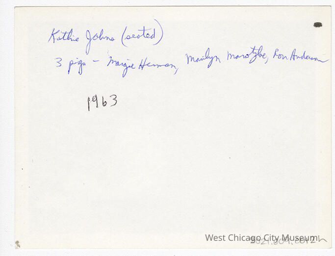h - Photograph, shows students in a play. There is a girl in a chair, a boy seated on the ground next to her, and 4 people standing behind. Many of the students have signs around their necks. Photo taken behind the teen on the floor. Back reads "Kathie Jahns (seated), 3 pigs - Margie Herman, Marilyn Marotzke, Ron Anderson"
