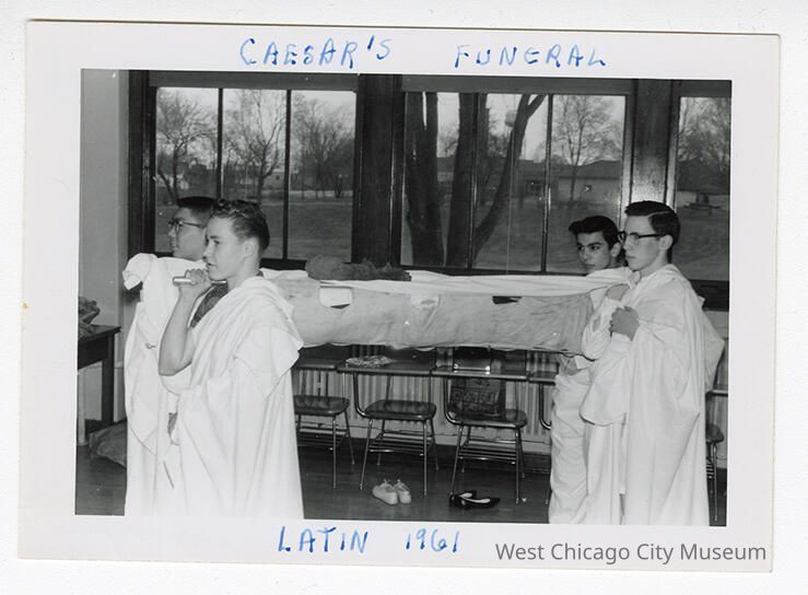 3 snapshot photographs, Caesar's Funeral, as portrayed by WCCHS Latin Club students in 1961.