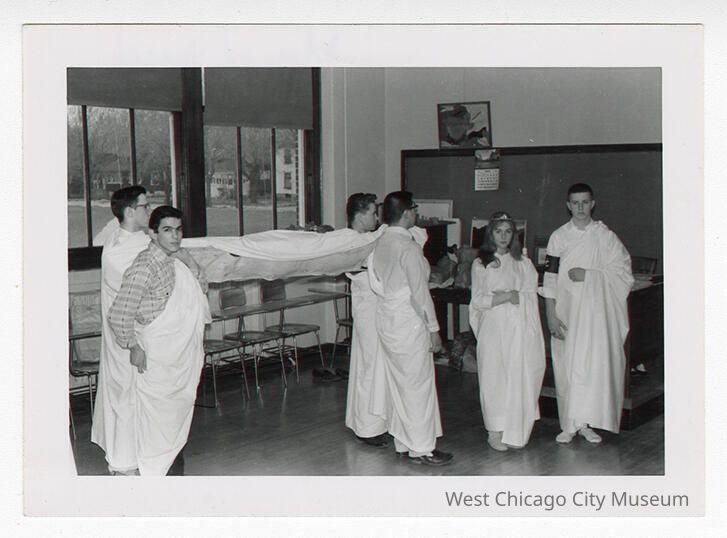 c - Shows a line of teenagers, draped in white togas over their clothes. They are in a classroom, with a wall of windows on the left, blackboard in the back wall. Back reads "Ides of March 1961" and identifies "Candy Stults, George Watanabe, Larry Nelson, Tony Ponzo, Jim Vidlak, Darrell Colford, Ilona Pinzke, Valerie Leslie, Nancy Tapken, Keith Knapp, Margie Herman, Kathy Jahns, Miss Stahl, Kathy Sproat, Me in Stretcher (Ron Anderson)"Photograph Details