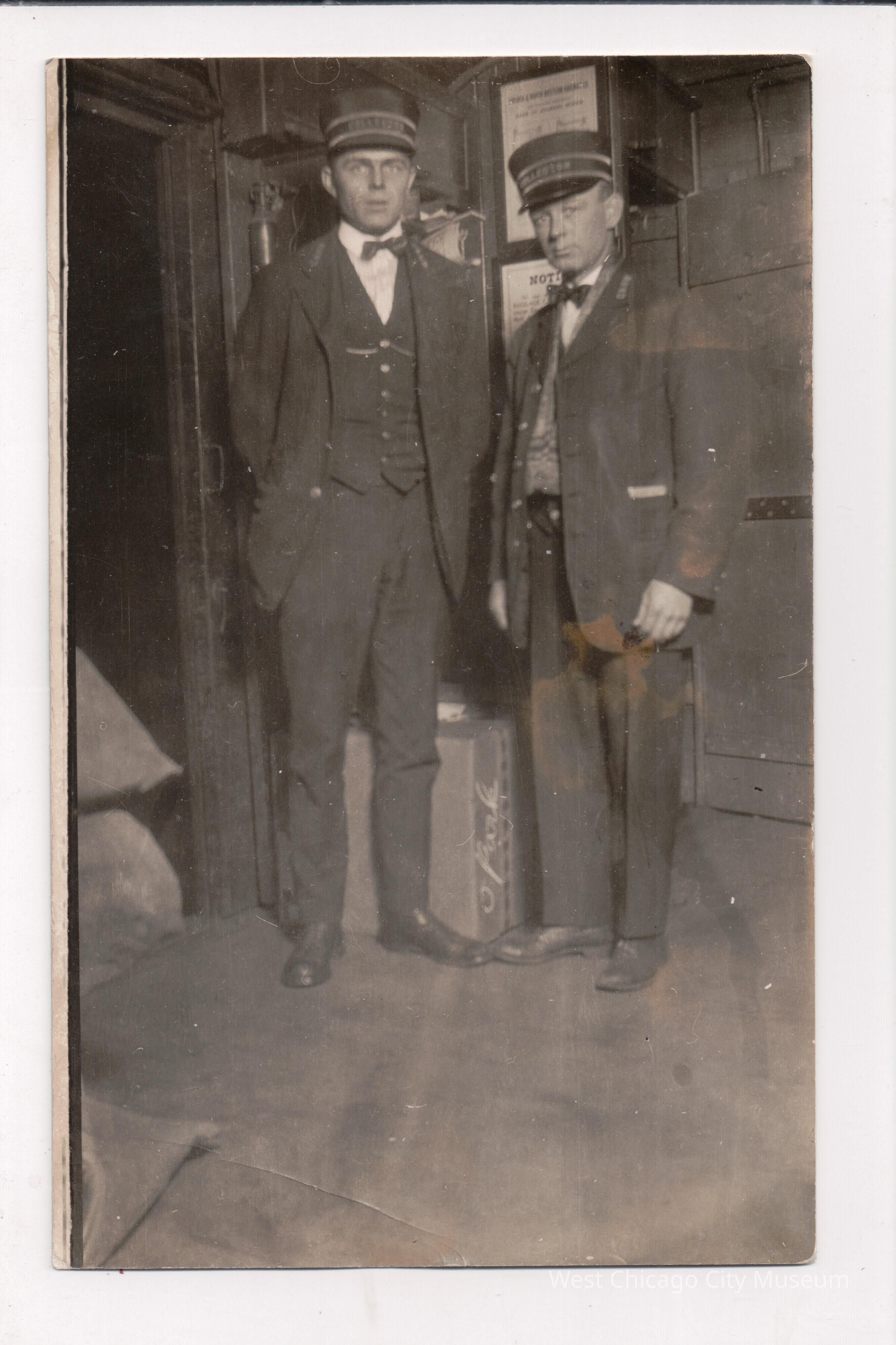 Photograph of 2 railroad men, Bert Kruse & Archie Rumph. They both are in conductors uniforms and could possibly be in a train car or depot.