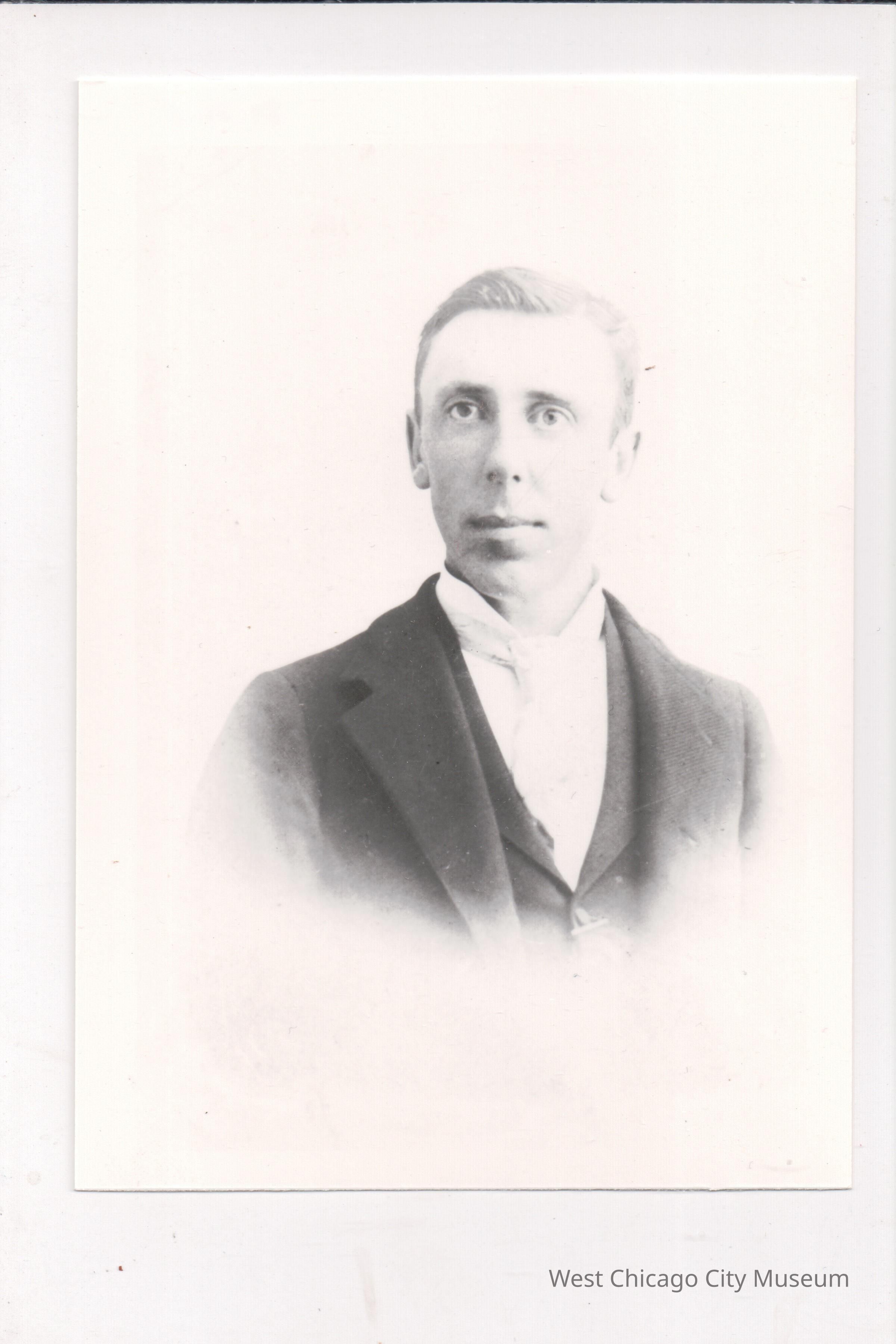 3 1/2 x 5 photograph of Mr. John W. Trainor. Shows him as a young man, clean shaven, with a dark suit and white shirt and tie, c. 1900