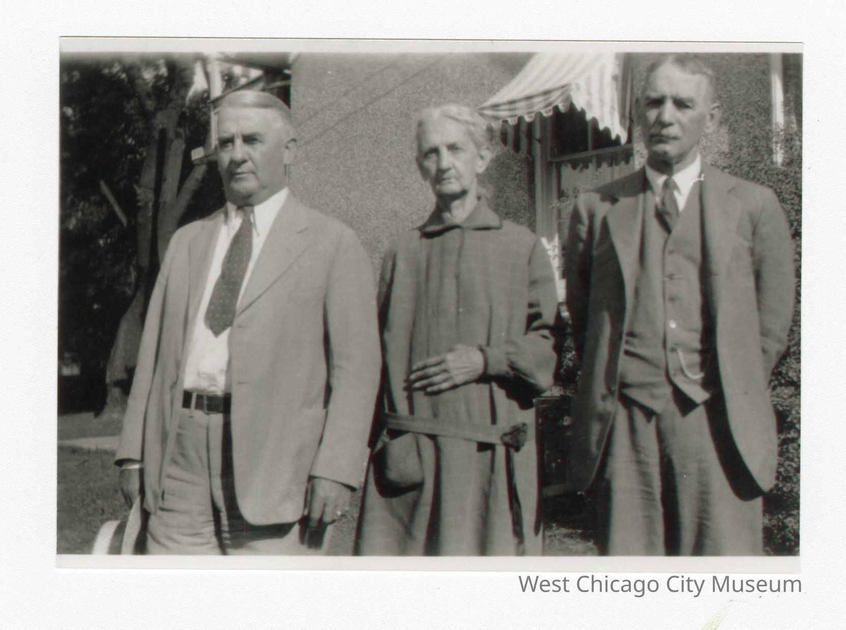 Black and white photo of three people standing in front of side of house. Woman in center with one arm resting across her mid section. Man in right in three piece suit with tie. Mustache. Man on left in suite and tie holding hat in hand.Collection