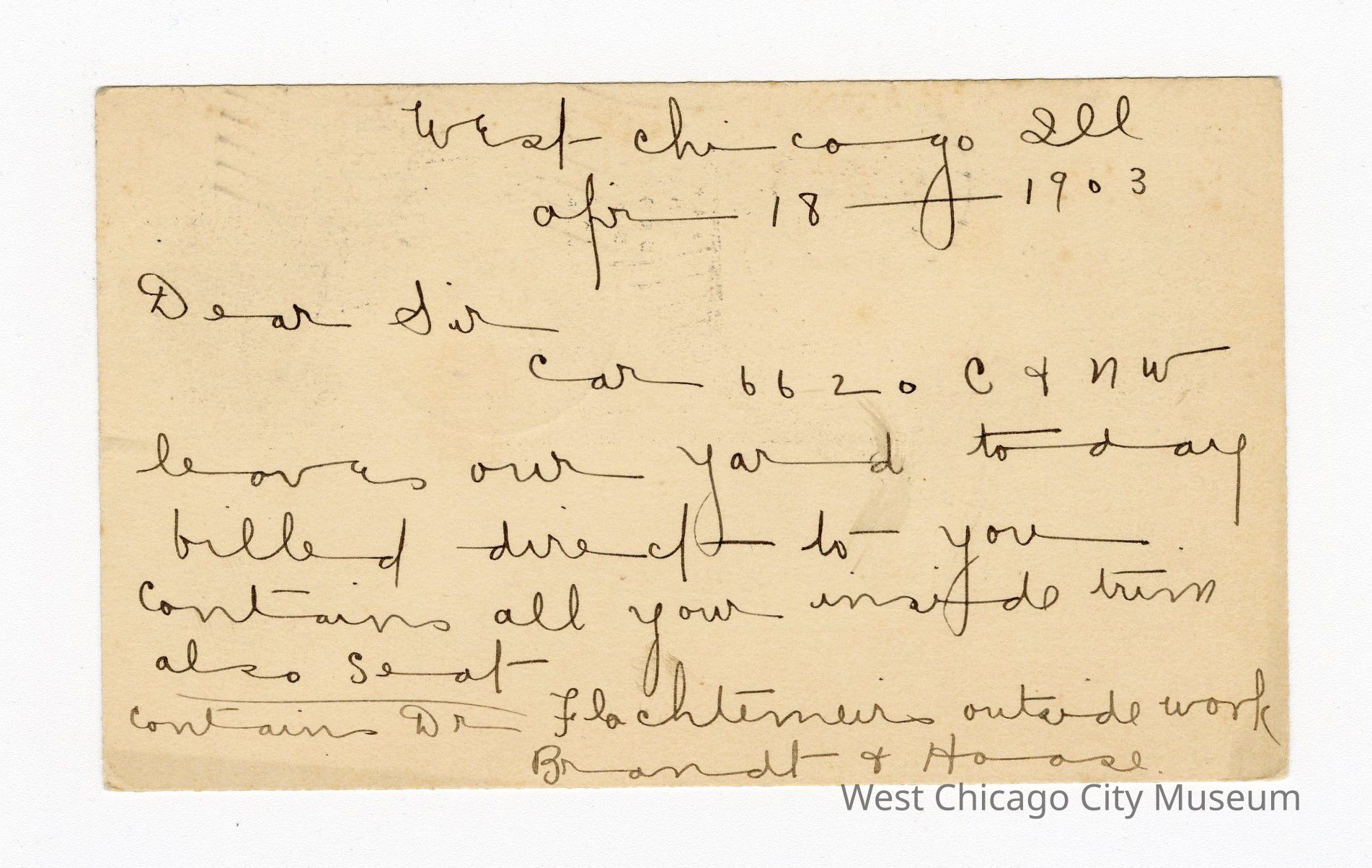 Postal card from Brandt, Hasse & Skinnen, dated Apr. 18, 1903