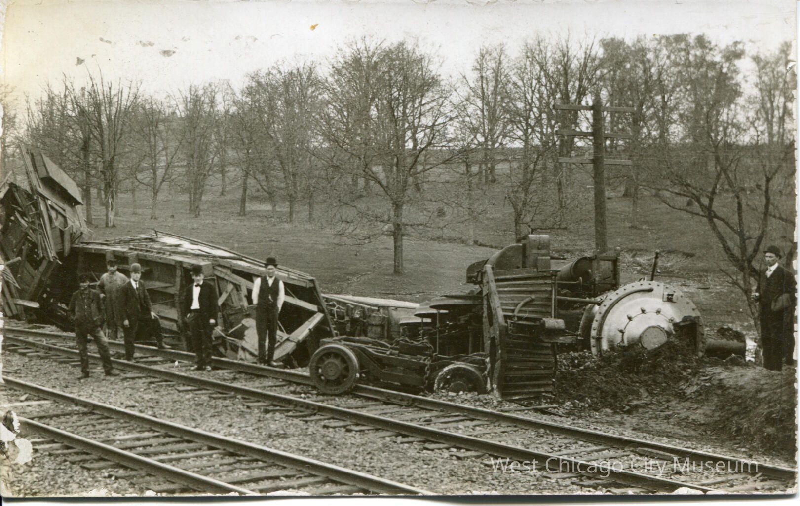 Grinell College has a copy of 1986.096.0014 in their collection, and describes the event as "View of the wrecked train. On April 23, 1908, southwest of DeWitt, Iowa, at Silver Creek, flooding weakened a bridge and gave way to stock train 132 where an engine and 17 cars of cattle fell into the water. Three crewmen perished in the wreck." https://digital.grinnell.edu/islandora/object/grinnell:16950
