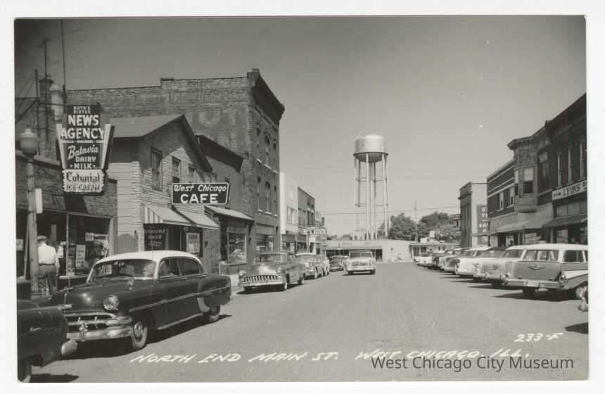 Photographic postcard of Main Street, c. 1955. The caption on each reads, "North End Main Street. West Chicago, ILL." and "233-F". Center of the image is the Water town. Visible signs on the left side of the street are Ruth E. Dieter News Agency, the West Chicago Cafe and a real estate office. On the right side, Lyon's is visible. The cars parked on the left are parallel with the street, and on the right, they are at a 45 degree angle.
