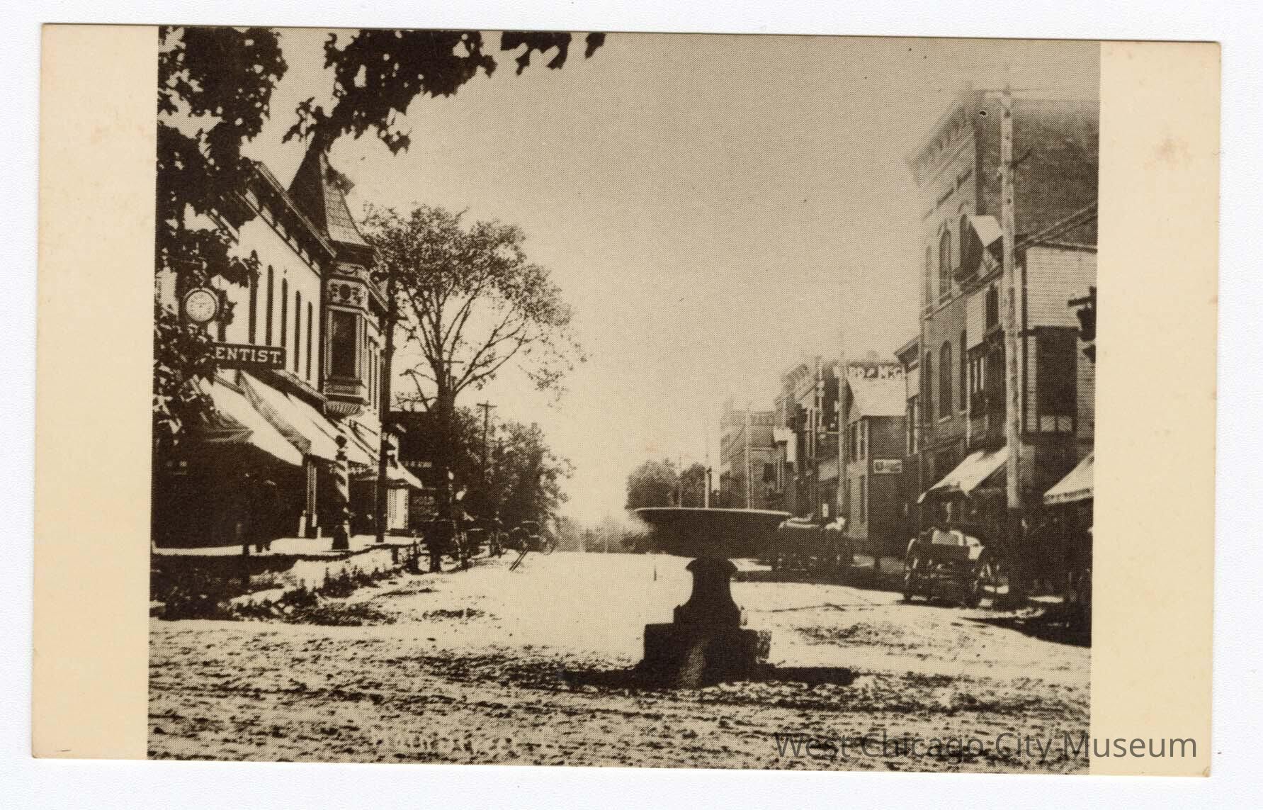Postcard, Photographic, showing West Chicago Main Street (Depot Street) Looking South from North Street (Washington Street). There is a pedestal with a basin in the center of the cross roads (a horse watering trough, according to the back, removed in 1896). Businesses line each side of the street; there is a Dentist on the left. Postcard was produced from a photo in the West Chicago Historical Museum's collection. Back is set up like a postcard, unusedPhotograph Details