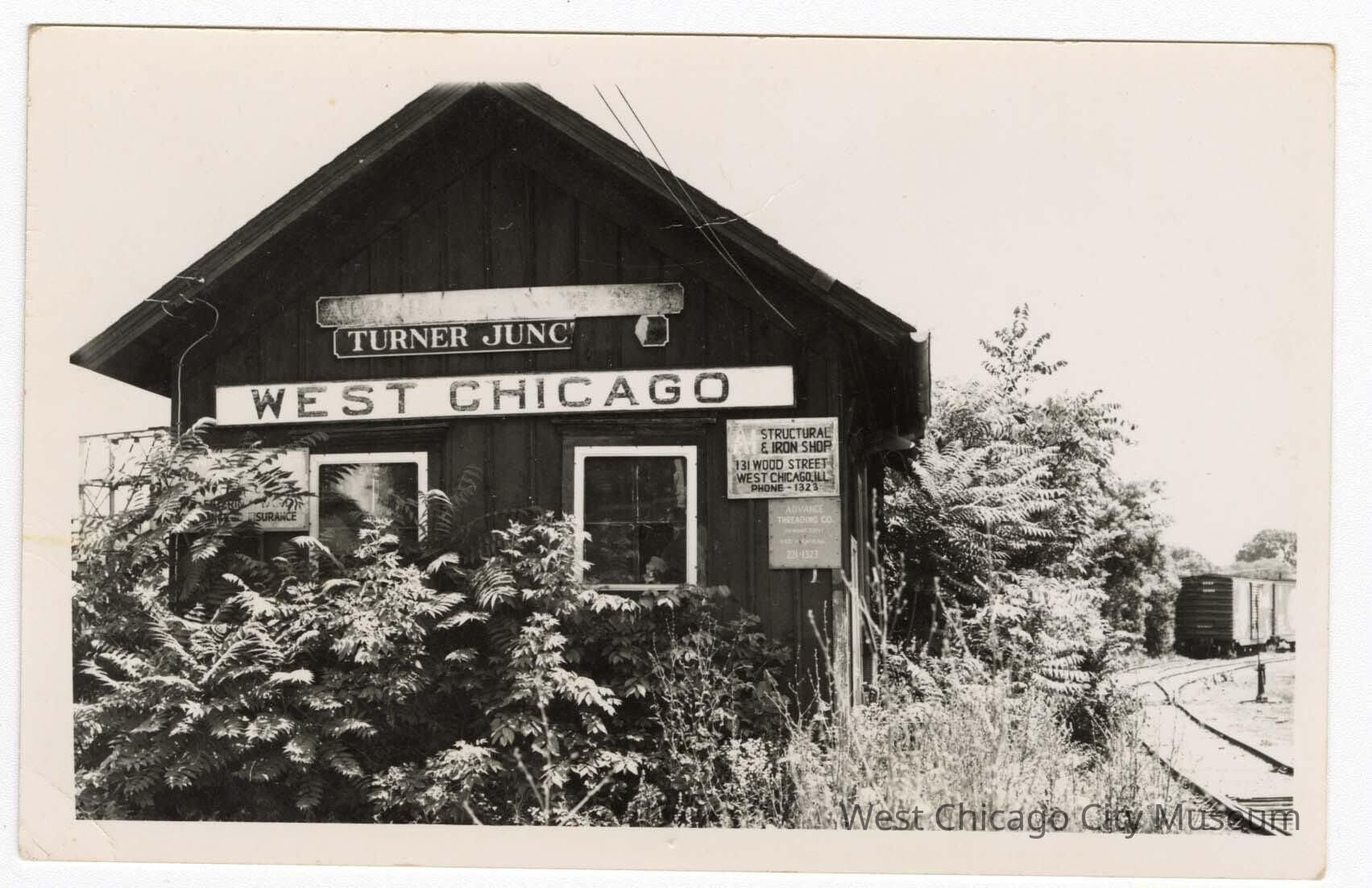 Postcard, unused. Front shows Black and White photo of the 1860s West Chicago Depot. 1 story building, has 3 long signs - "Aurora Branch RR", Turner Junction" and "West Chicago. Smaller sign reads "Structural and Iron Shop / 131 Wood Street / West Chicago / Phone 1323" Lots of plant overgrowth, picture is taken from end / trackside - you can see tracks with boxcar on them. Back is set up like a postcard, but unused.Photograph Details