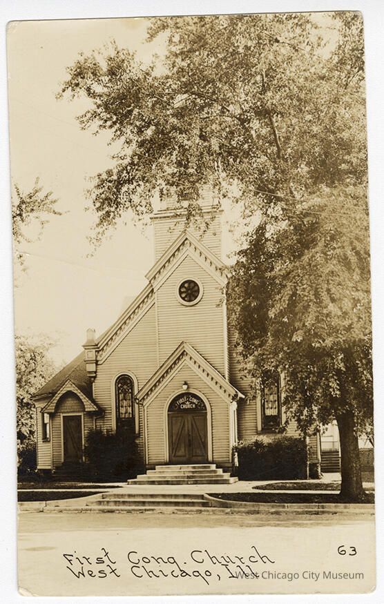 Postcard, shows a black and white photograph of the First Congregational Church, West Chicago. Church has white siding, a traditional steeple and reads "First Cong Church" in half circle glass above doors. Photo is in portrait orientation, with white strip at bottom. Back has standard postcard configuration, never used.Photograph Details