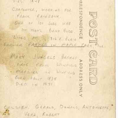 Anthony (Tony) Berkes, Born: 1879, Came to WC 1917, earlier in Kansas, Died: 1948, Carpenter working for Frank Fairbank, One of 1st jobs was 1st Nat'l Bank bldg., earlier farmed in Maple Park, Ill.Language