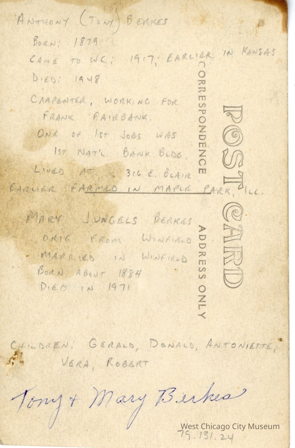 Anthony (Tony) Berkes, Born: 1879, Came to WC 1917, earlier in Kansas, Died: 1948, Carpenter working for Frank Fairbank, One of 1st jobs was 1st Nat'l Bank bldg., earlier farmed in Maple Park, Ill.