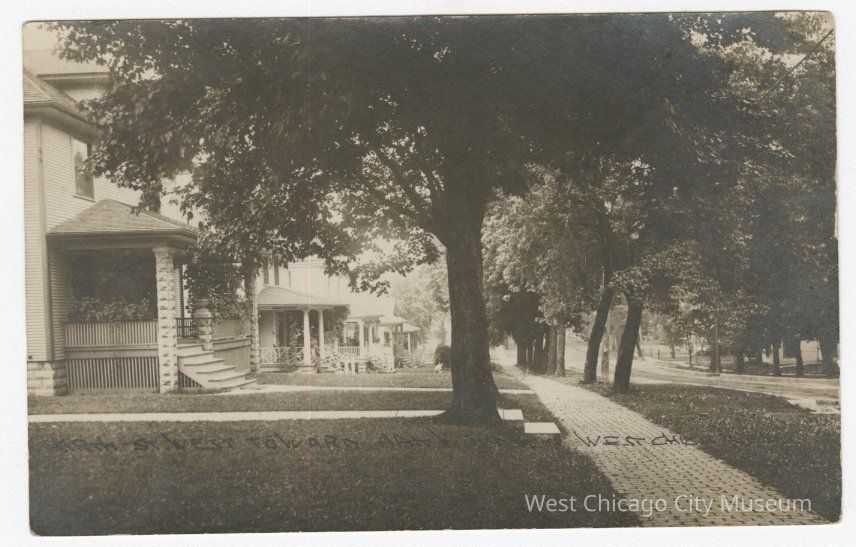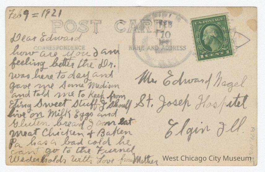 Photographic postcard. Caption reads, "North Street Towards [?], West Chicago, Ill." On reverse is a one cent George Washington stamp, a postal cancellation which is blurred, but "Feb 10" can be seen. Address reads, "Mr. Ed. Nagel St. Joseph Hospital, Elgin Ill" and a script which reads, "Feb 9 = 1921