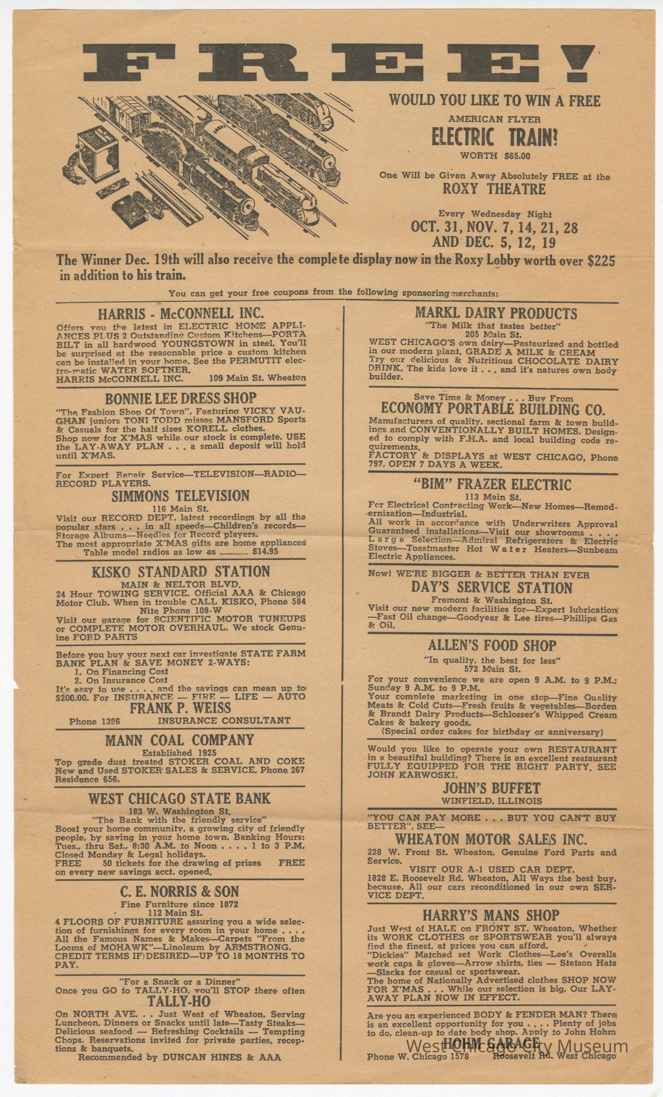 Advertisement Poster for a giveaway for an American Flyer Electric Train in the Roxy Theater Lobby. The give away started each Wednesday night from October 31 - Dec 19th. There are small advertisements from merchants that are sponsoring the giveaway: Harris-McConnell Inc (109 Main Wheaton), Bonnie Lee Dress Shop, Simmons Television (116 Main Street), Kisko Standard Station (Main and Neltor Blvd), Frank P. Weiss - State Farm insurance agent, Mann Coal Company, West Chicago State Bank (183 W. WAshingotn St.), C. E. Norris & Son (112 Main street), Tally-Ho Restaurant (North Ave), Markl Dairy Products (205 Main Street), Economy Portable Building Co., "Bim" Frazier Electric (113 Main Street), Day's Service Station (Fremont & Washington Street), Allen's Food Shop (572 MAin Street), John's Buffet (Winfield), Wheaton Motor Sales (228 W. Front Street), Harry's Mans Shop (Front Street, Wheaton), Hohm Garage (Roosevelt Rd)Lexicon