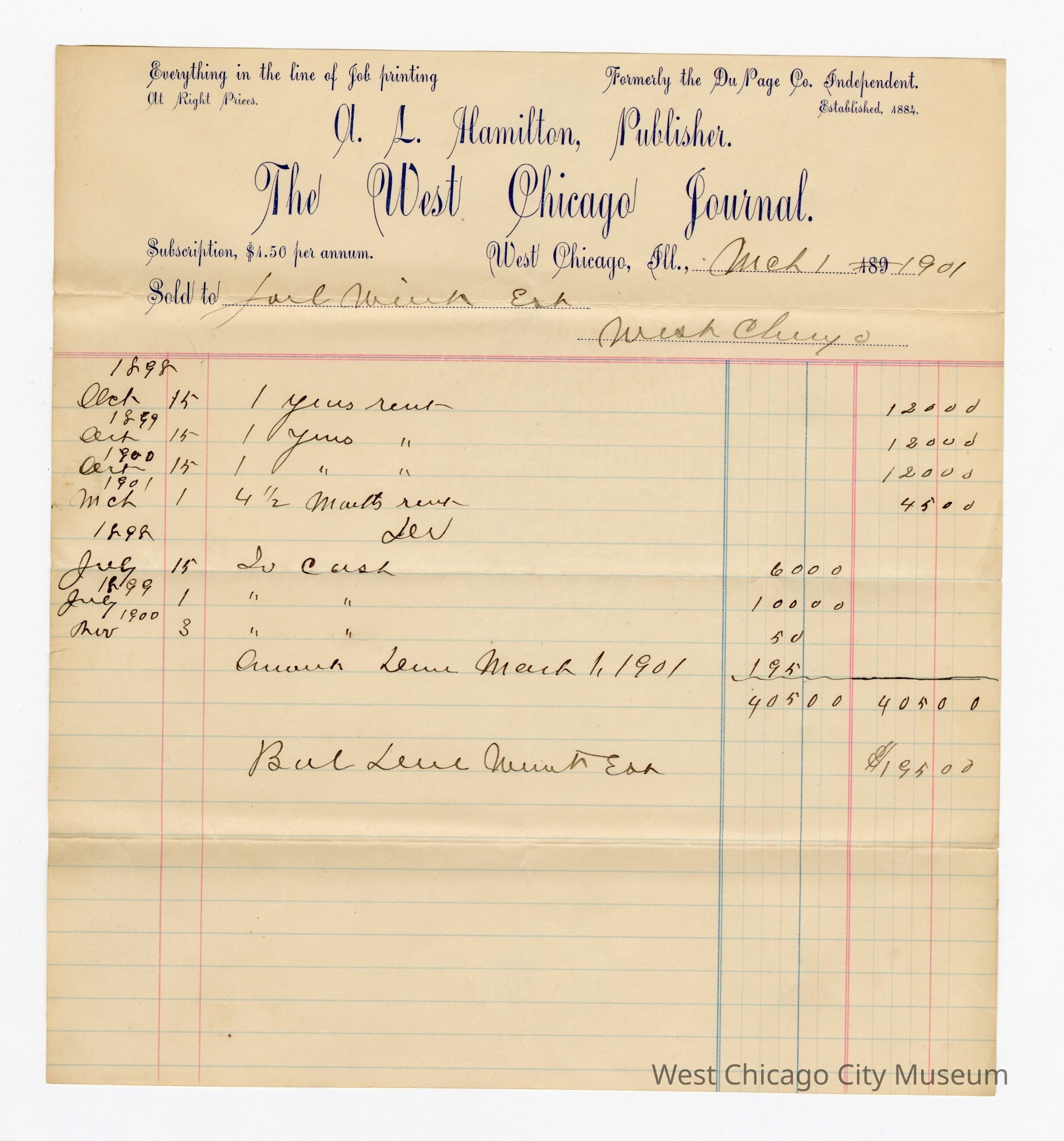 Receipt, The West Chicago Journal, Joel Wiant, Est. 1901Collection