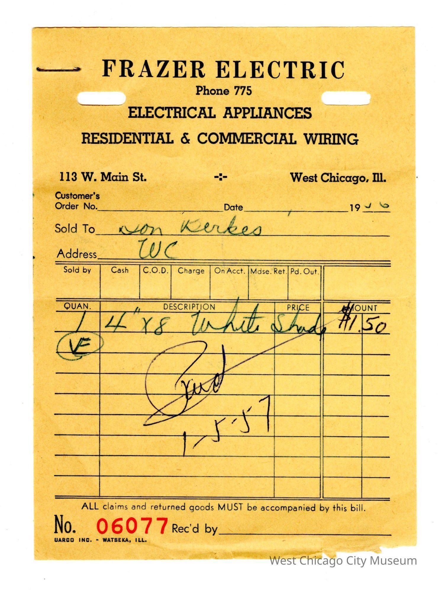 Receipt, Frazer Electric 113 W Main St., Don Berkes
