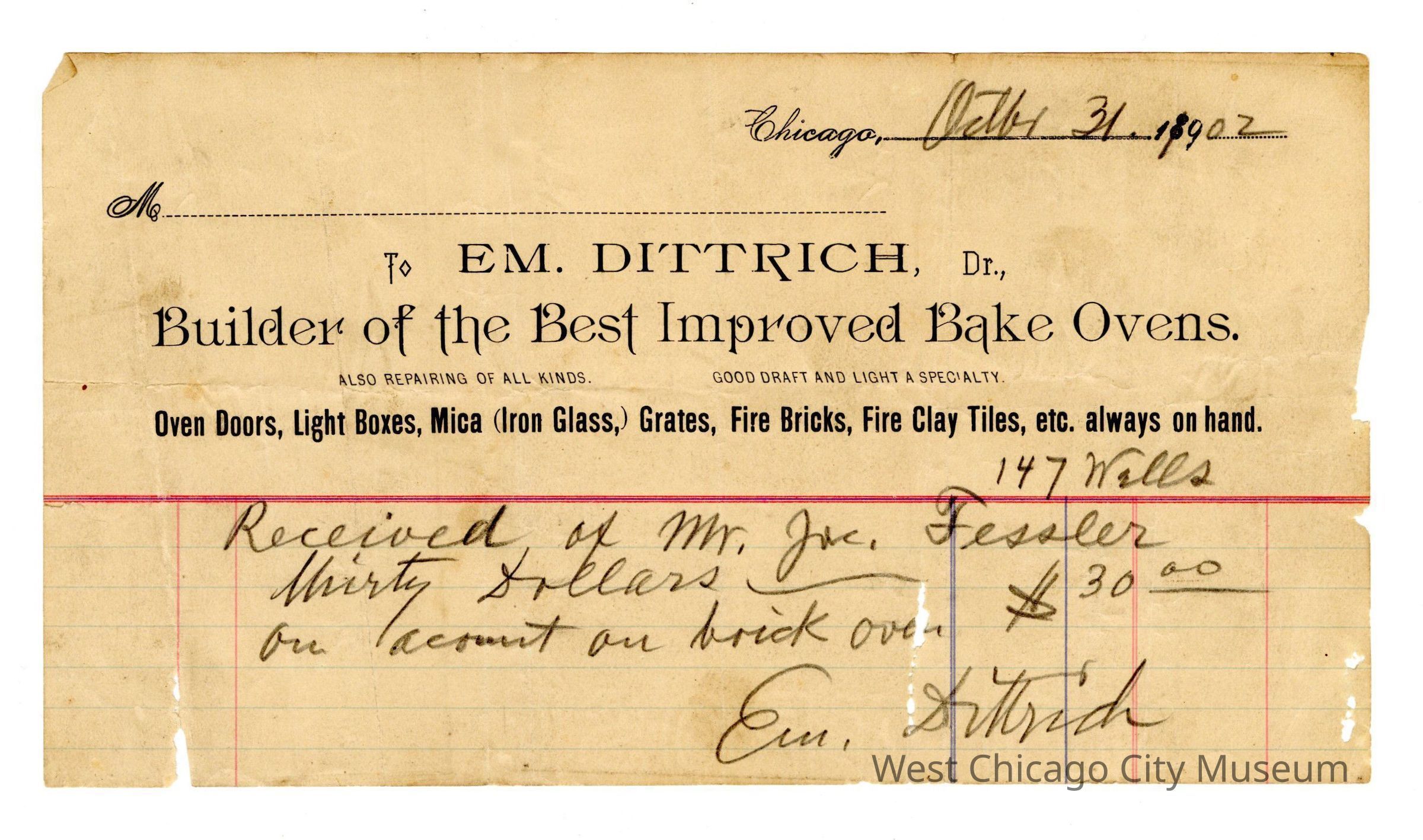 Receipt, E.M. Dittrich, October 31, 1902, received of Mr. Jac. Fessler 30.00 on acct. on brick over, 8 3/16" w x 4 1/2" h. small holes.