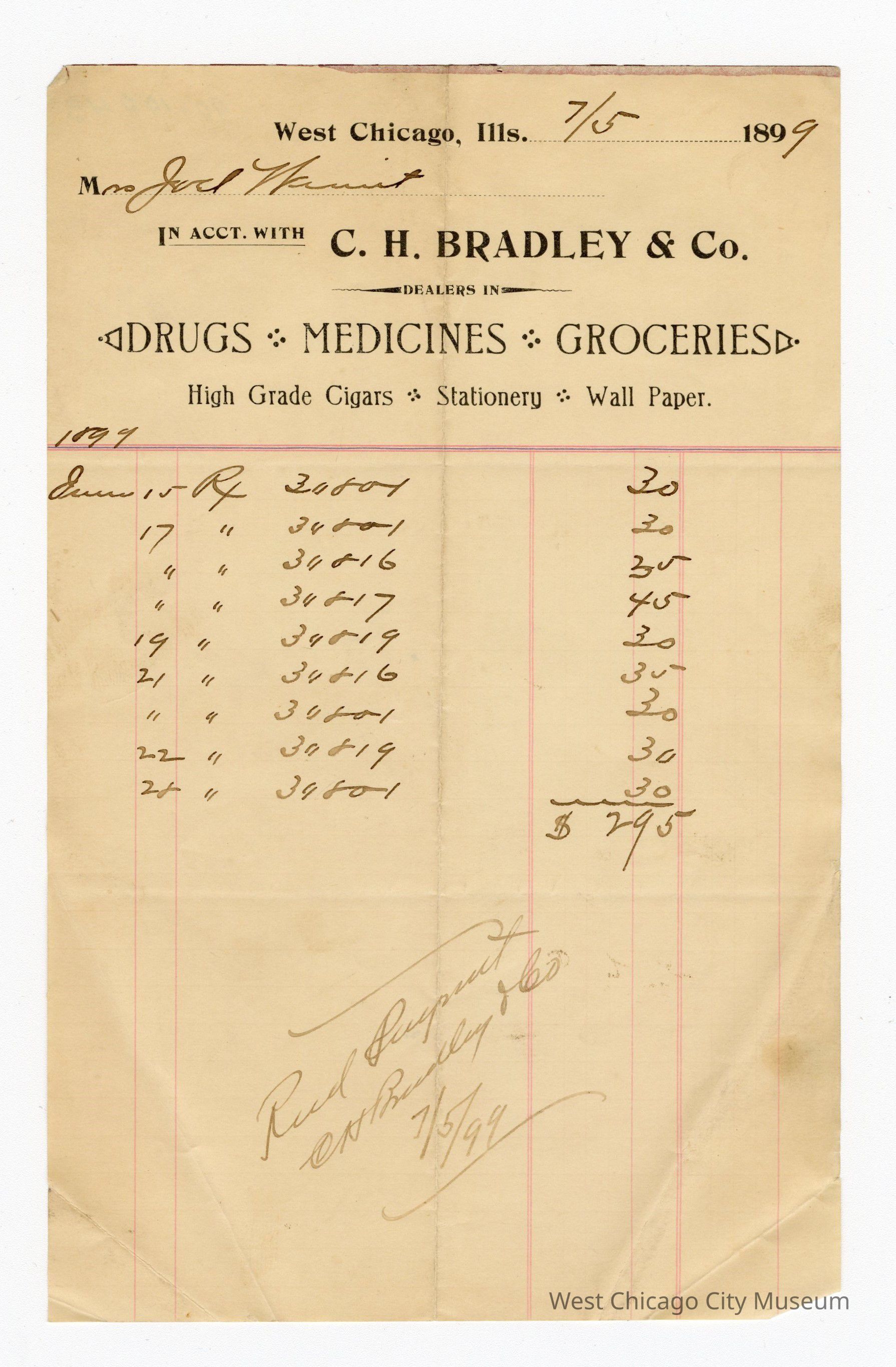 Statement, C.H. Bradley & Co. in acct. with Mrs. Joel Wiant, July 5, 1899-notation for Rec'd. payment 7/5/99 (1899)