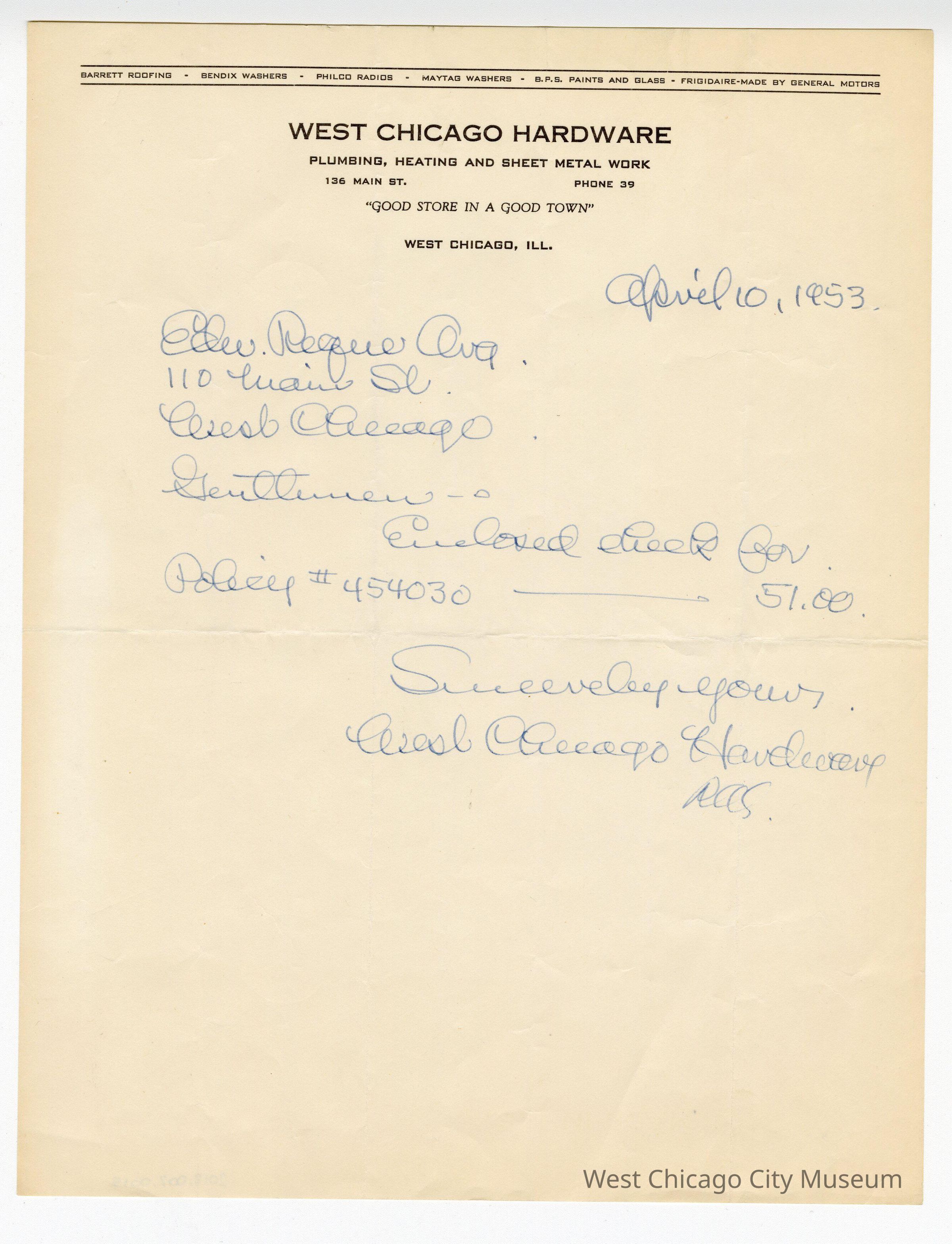 Receipt, West Chicago Hardware, Plumbing, Heating and Sheet Metal Work., April 10, 1953.Collection