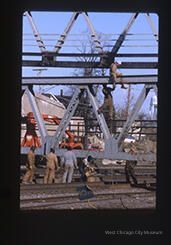 Slide, color, showing deconstruction of Wilson Street bridge. Portrait orientation. Shows 7 workers in thick coats and overalls working on a truss for the bridge. They are under the bridge, on the railroad tracks. The slide holder is white, and marked "17" in the upper left corner, and embossed "Jul 87"