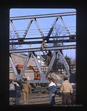 Slide, color, showing deconstruction of Wilson Street bridge. Portrait orientation. Shows people, workers and bystanders, working on a truss for the bridge. They are under the bridge, on the railroad tracks. The slide holder is white, and marked "15" in the upper left corner, and embossed "Jul 87"