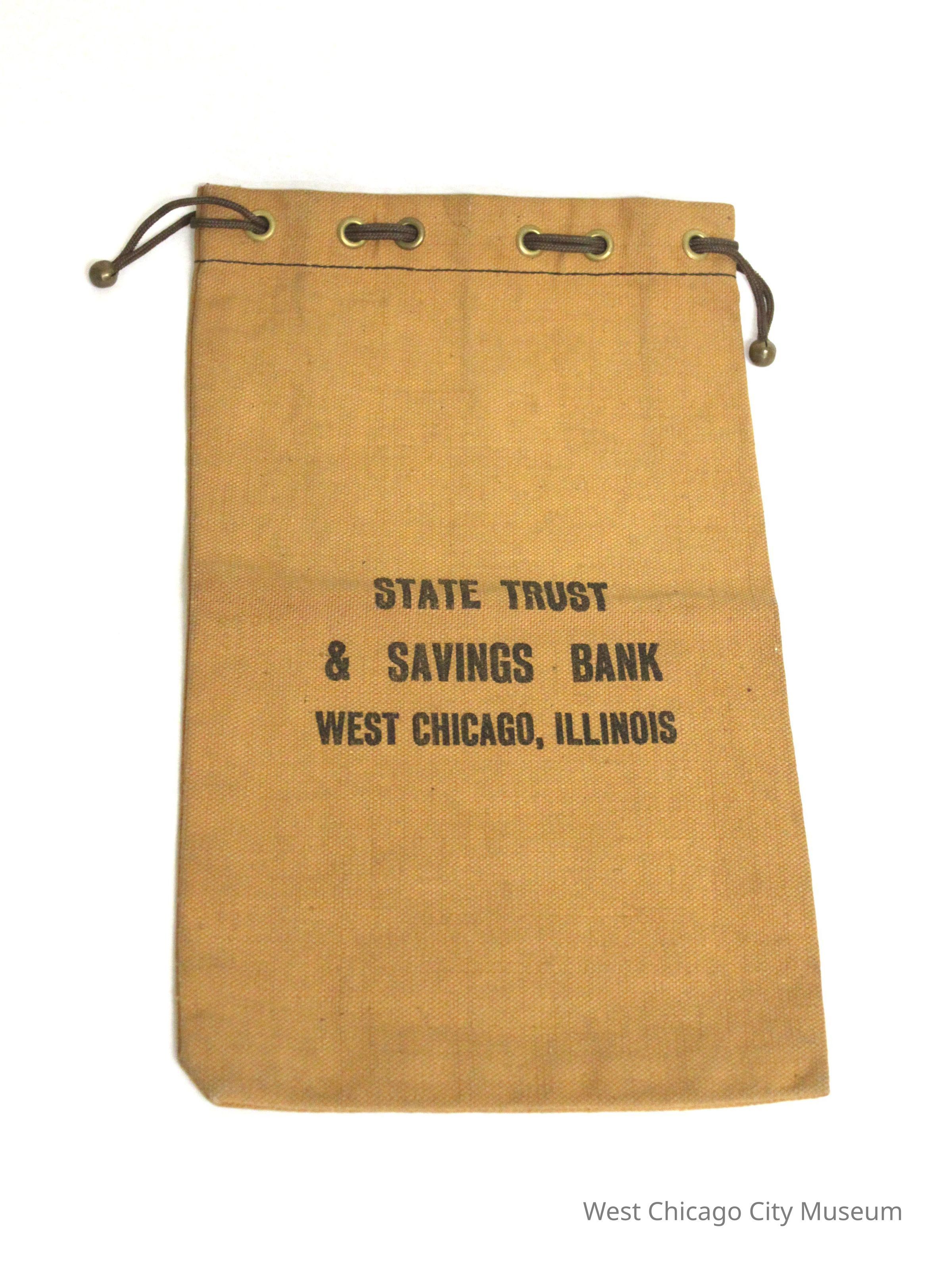 State Trust & Savings Bank money bag. Bag is made of a brown, canvas-like fabric and has a dark brown drawstring top, which you pull from both sides to close. Printed on both sides is "State Trust & Savings Bank West Chicago, Illinois"Inscription/Signature/Marks