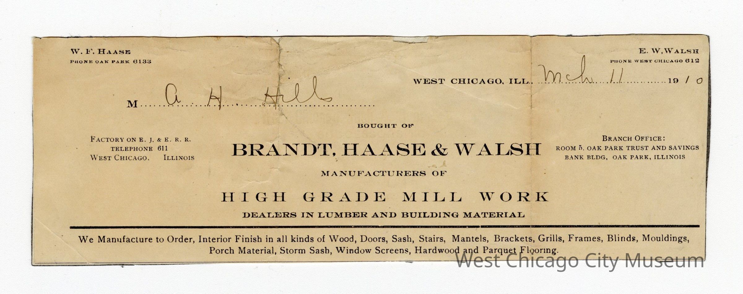 Brandt, Haase & Walsh mill work business statement 1910Collection