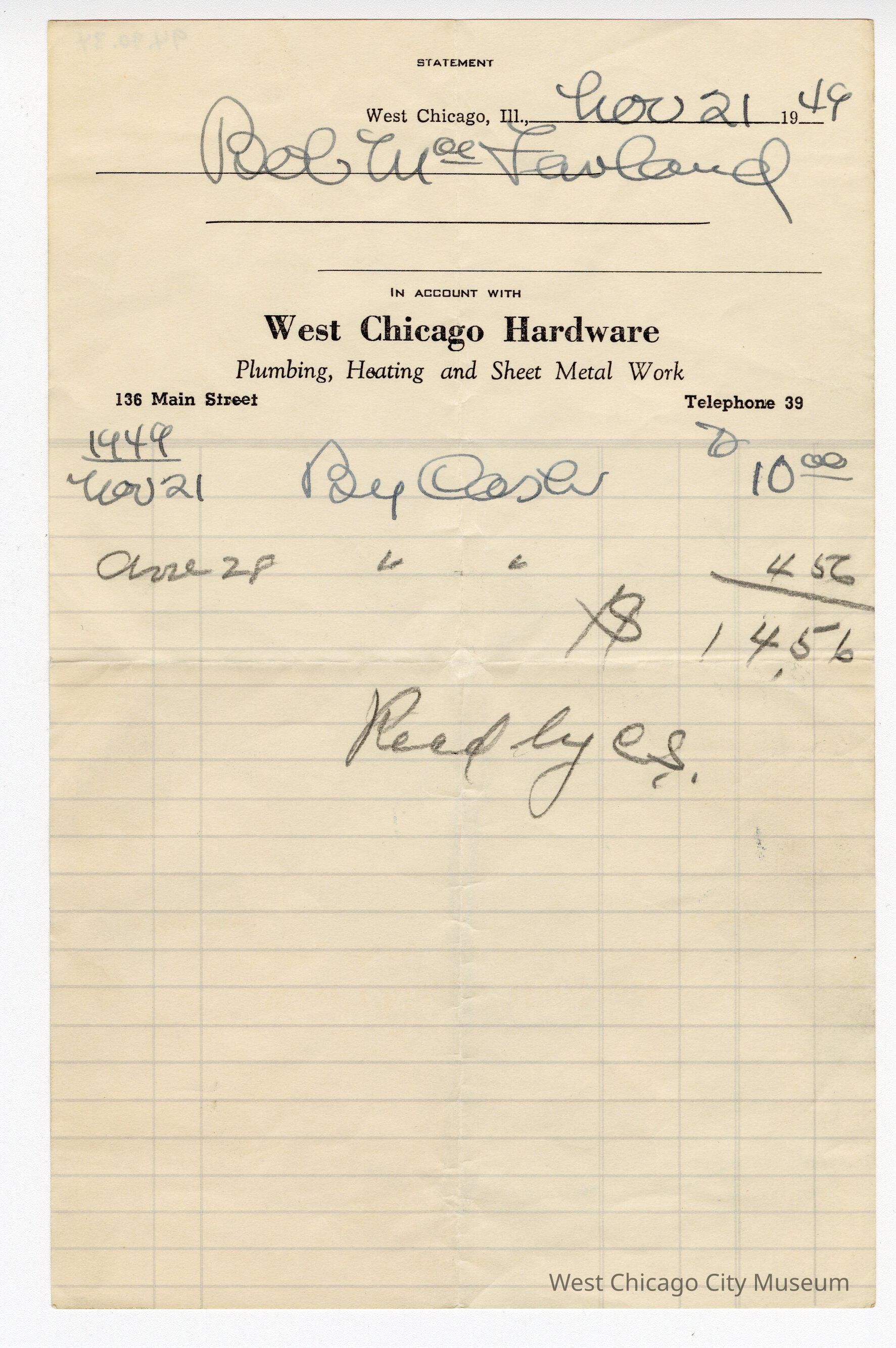 West Chicago Hardware 136 Main St; Statement, Nov. 21, 1949-8 1/2" x 5 1/2" Bob McFarlandCollection