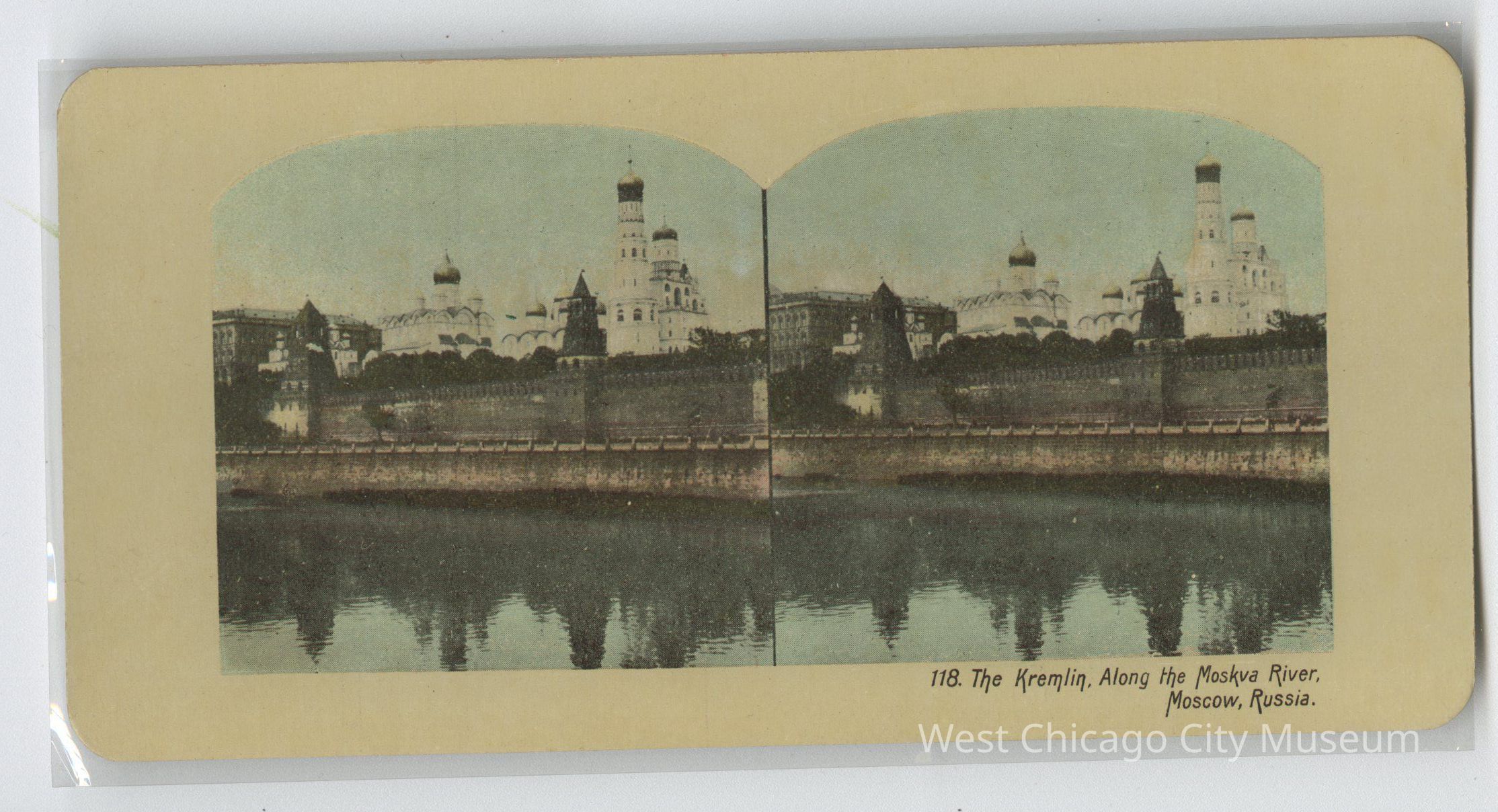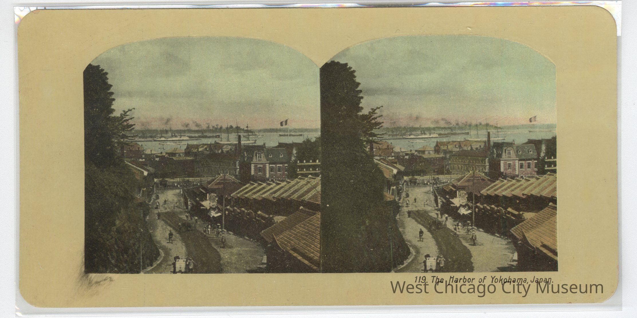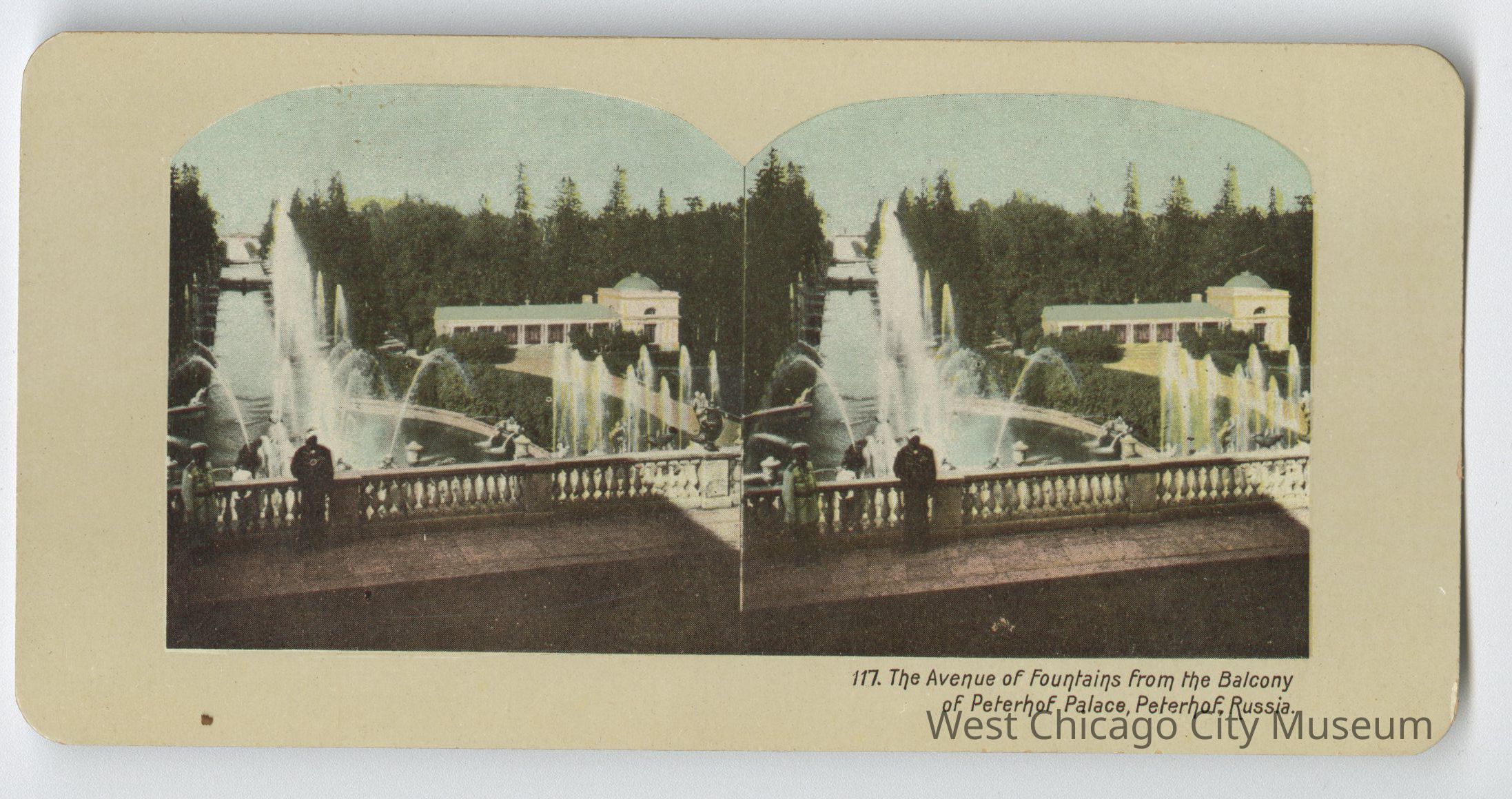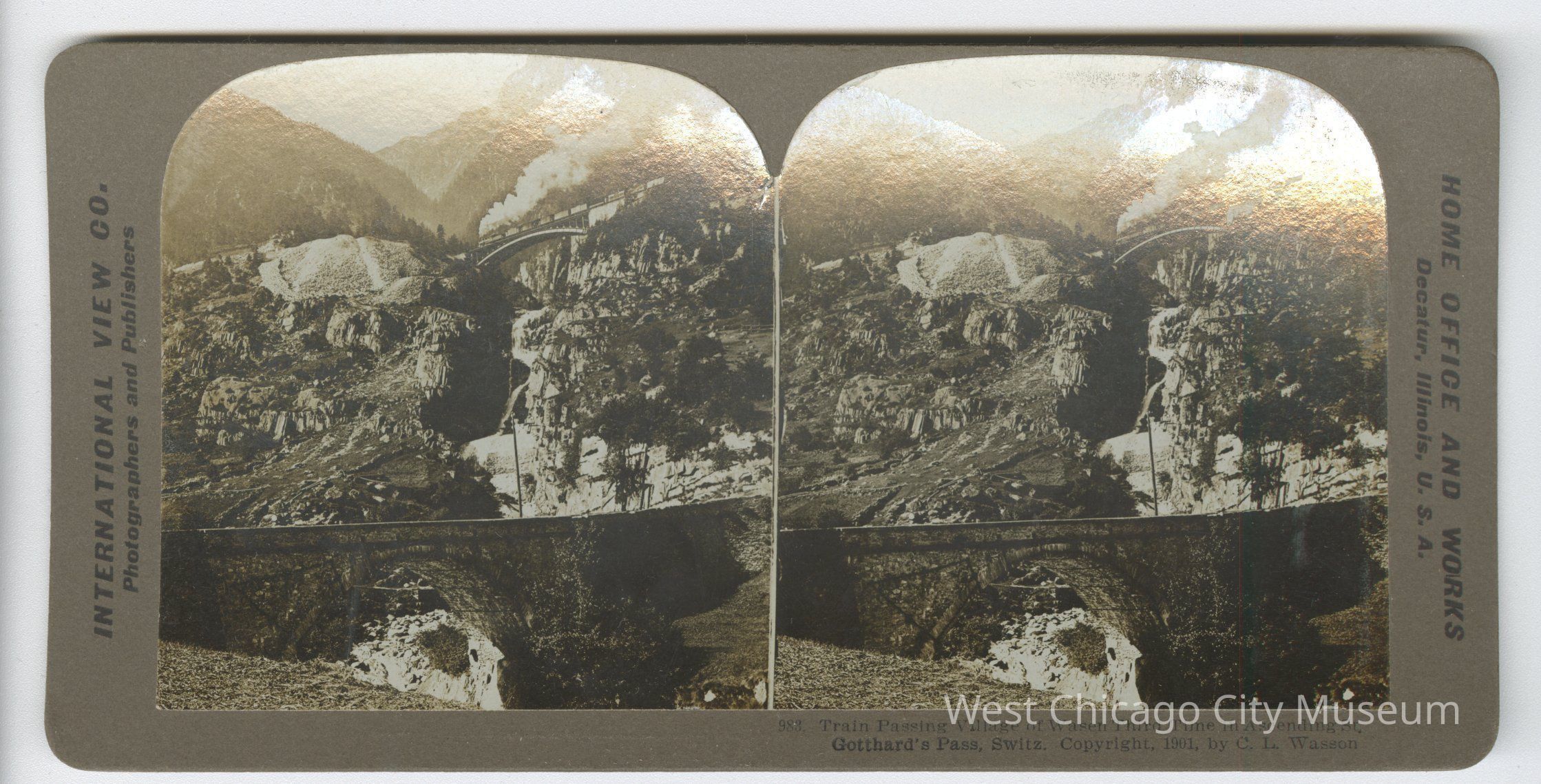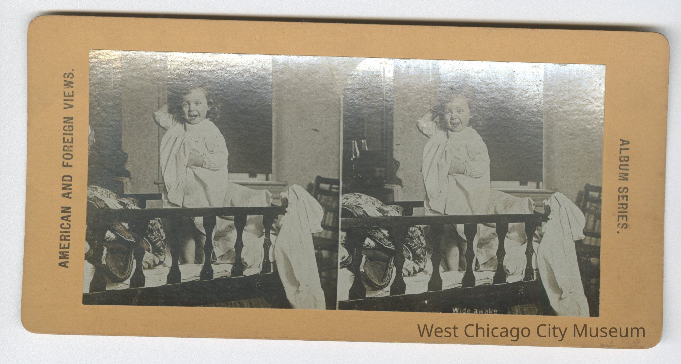 Stereoscope cards (Stereographs), Black and white. They show picturesque scenes around the world and domestic scenes a – “Sad last Home-Coming of President McKinley – Arrival” 1901 b – “Train passing Village of Wasen Third time in Ascending St. Gottard’s Pass, Switz.” 1901 c- “Wide awake” Showing a toddler in a crib, standing d – “117 The Avenue of Fountains from the Balcony of Peterhof Palace, Peterhof, Russia” e – “118 The Kremlin Along the Moskova River, Moscow, Russia” f – “119 The Harbor of Yokohama, Japan”