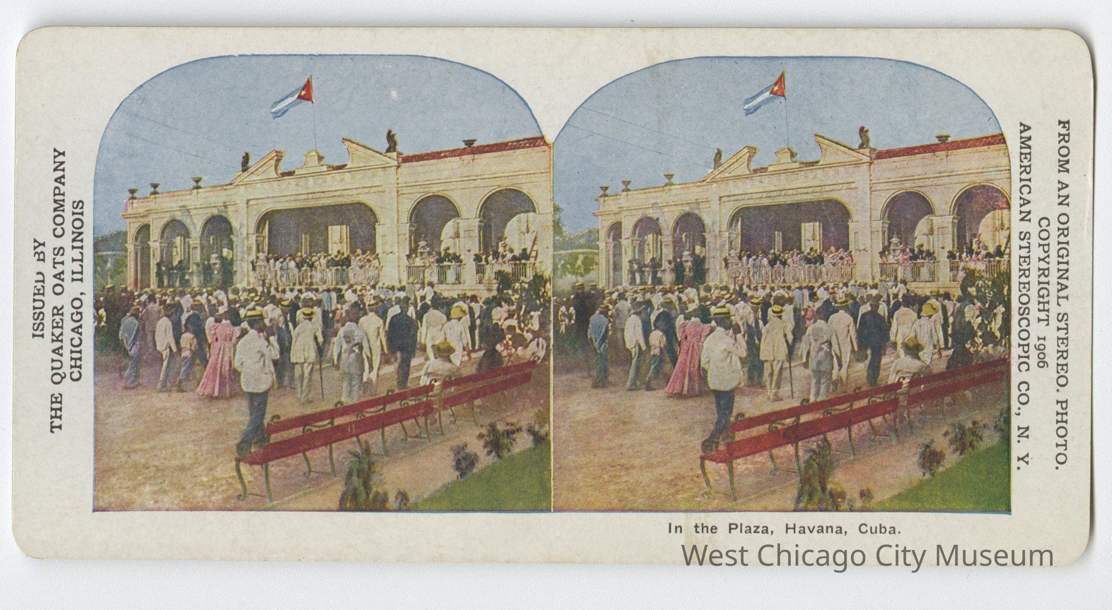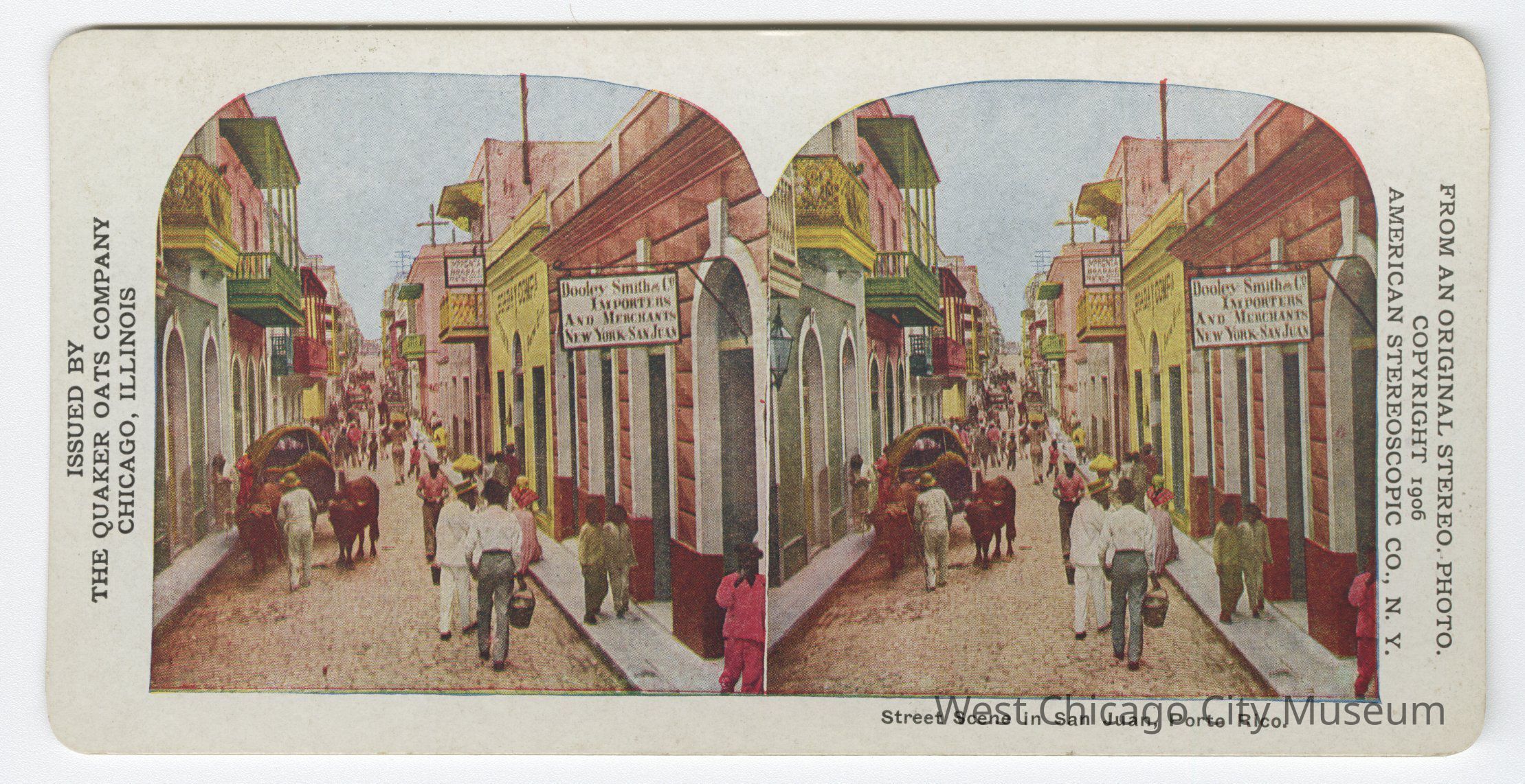 Stereoscope cards (Stereographs), full color, issued by the Quaker Oats Company, Chicago Illinois, produced by the American Stereoscopic Company, Copyright 1906. Cards are grouped by location. They show scenes of life and the landscape