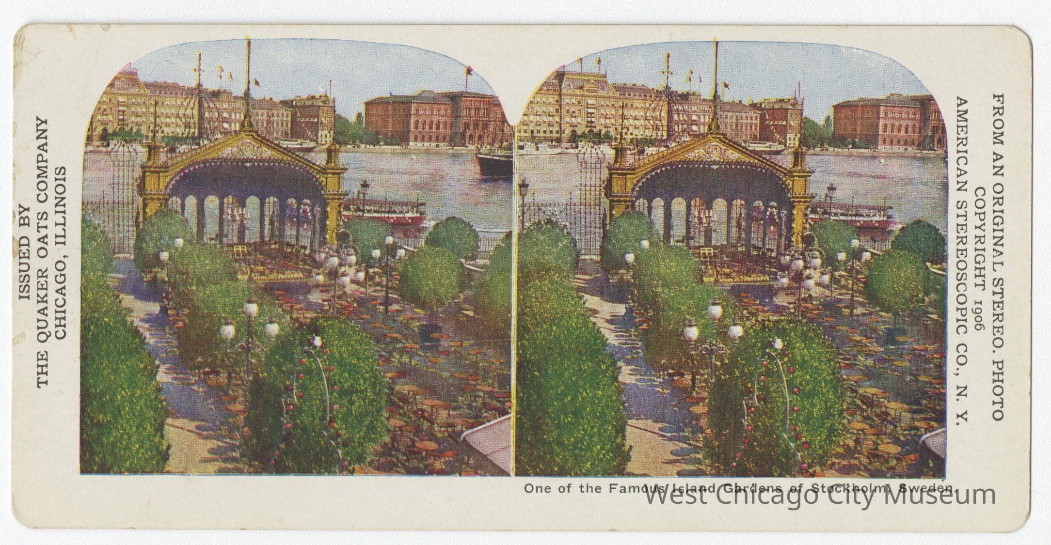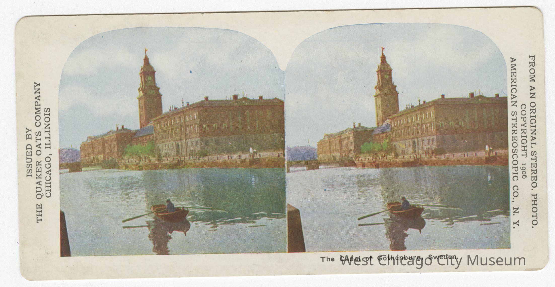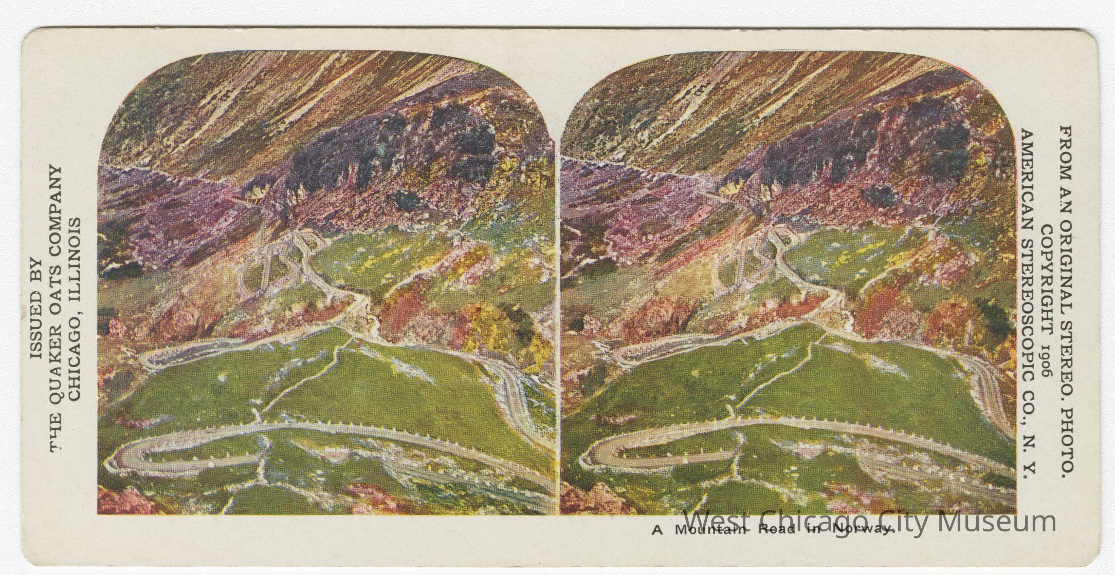 Stereoscope cards (Stereographs), issued by the Quaker Oats Company, Chicago Illinois, produced by the American Stereoscopic Company, Copyright 1906. Cards are grouped by location. They show scenes of live and the landscape
