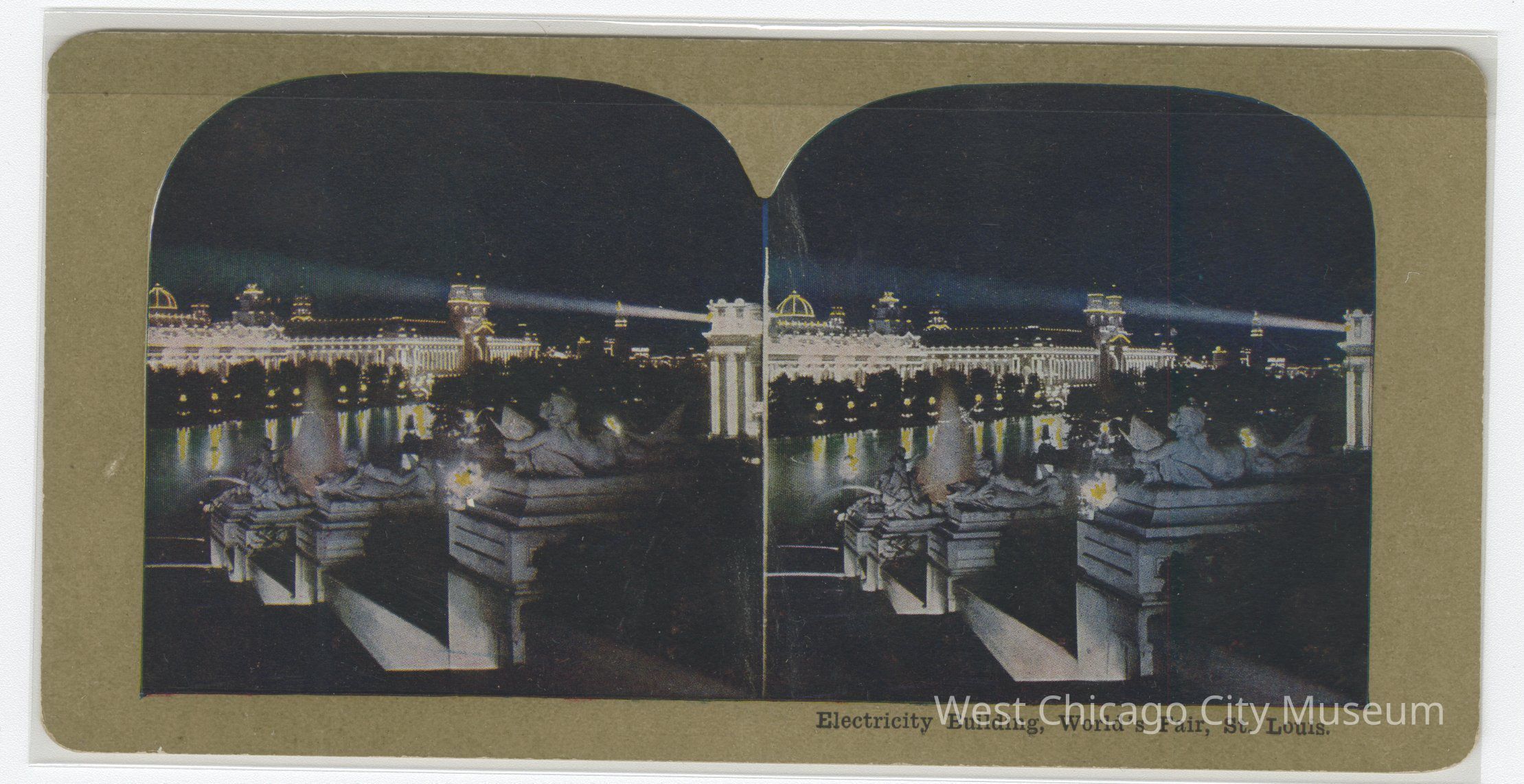 Stereoscope cards (Stereographs), full color. Shows two side by side images, taken eye width apart. Green background. Back reads "Around the world Without leaving your home - just like being there" c 1905. Cards are grouped by location. They show scenes of life and the landscape a- "General View of the Pike, World's Fair, St. Louis" b - "Electricity Building, World's Fair, St. Louis"