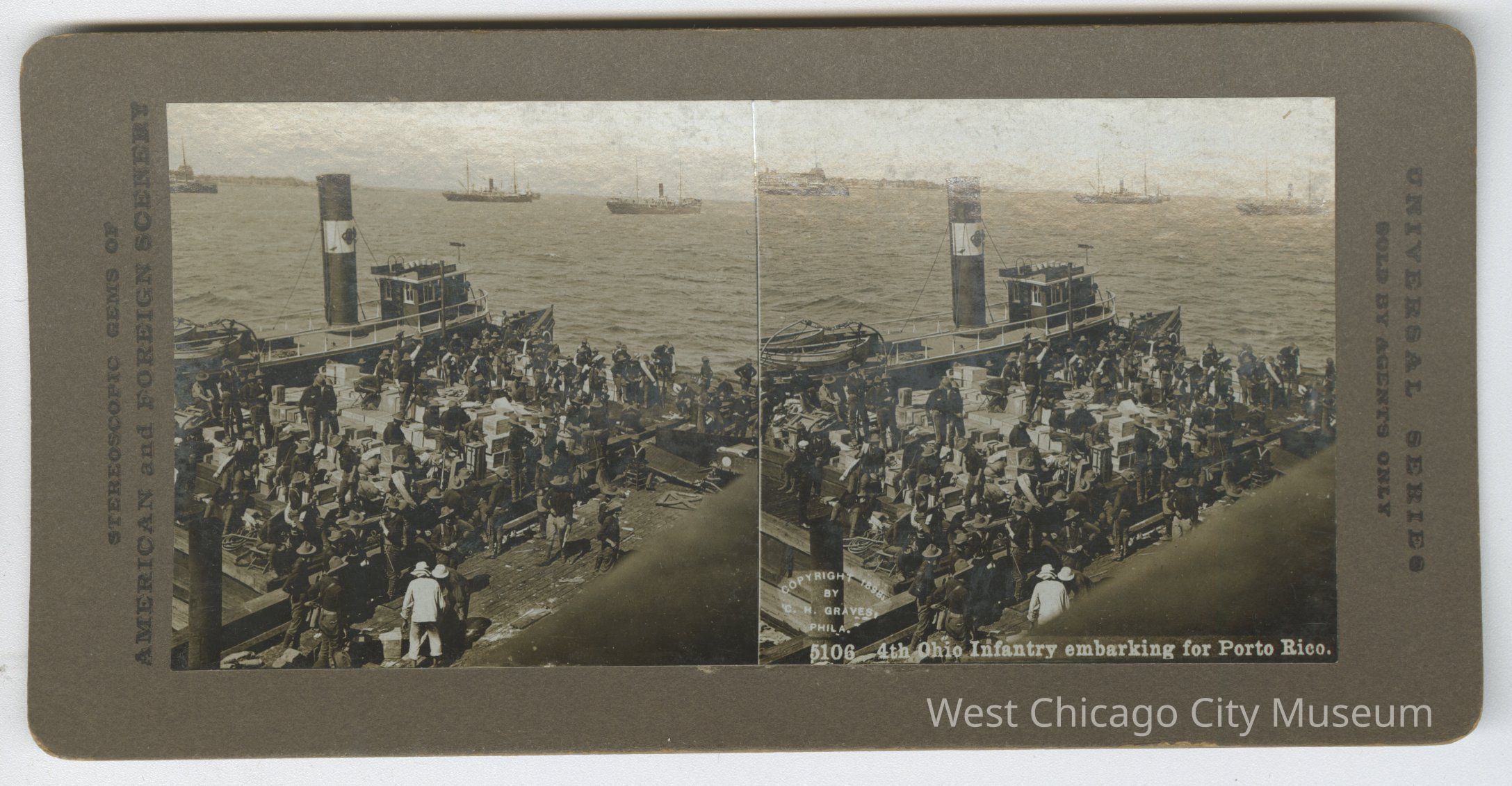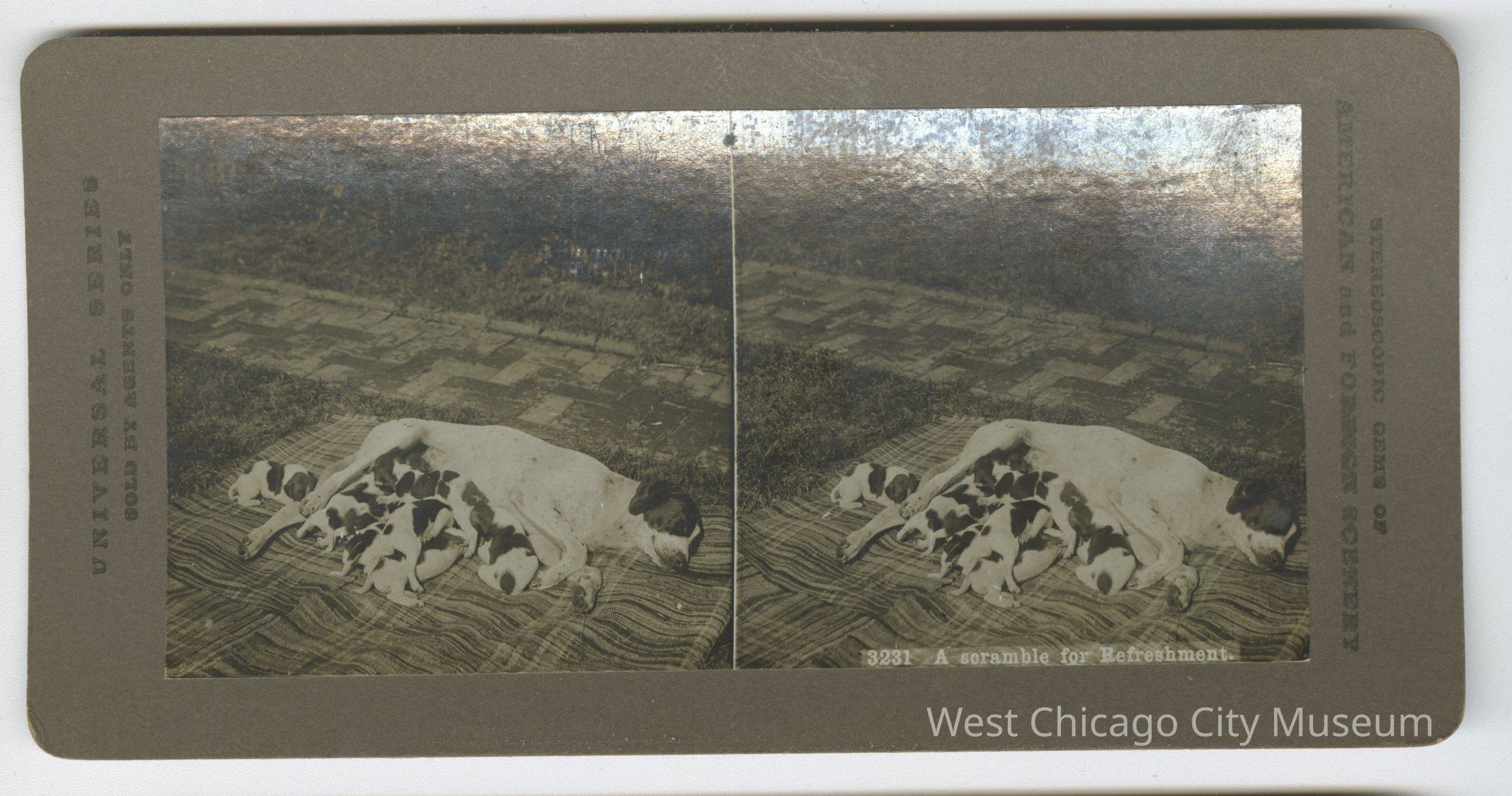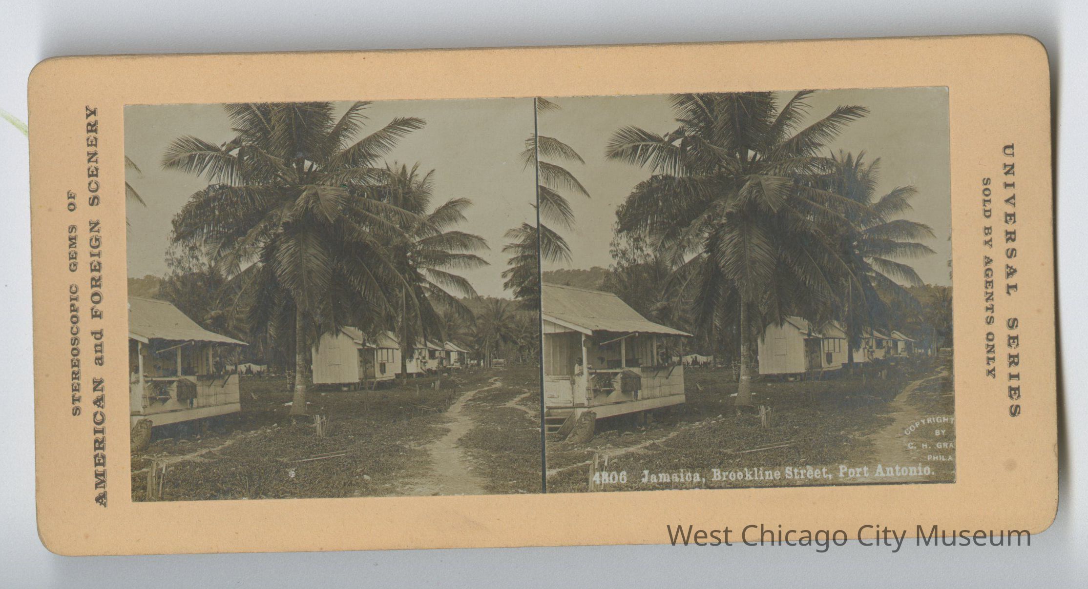 Stereoscope cards (Stereographs), Black and white, entitle "Stereoscopic gems of America and Forgiven Scenery". Cards are grouped by location / topic. They show picturesque scenes around the world and domestic life a – “3218 Amusing the baby” b – “4806 Jamaica, Brookline Street, Port Antonio” c – “3231 A Scramble for Refreshment” - shows dog with puppies d – “5106 4th Ohio Infantry embarking for Puerto Rico” e – “2852 Houses on Lake Luzerne, Switzerland” f – “459 Arabia, a garden in Wady Feiran” g – “2524 Paris Trinity Church Grand Entrance”