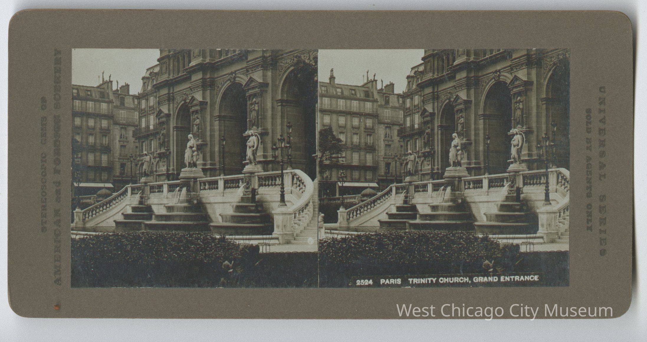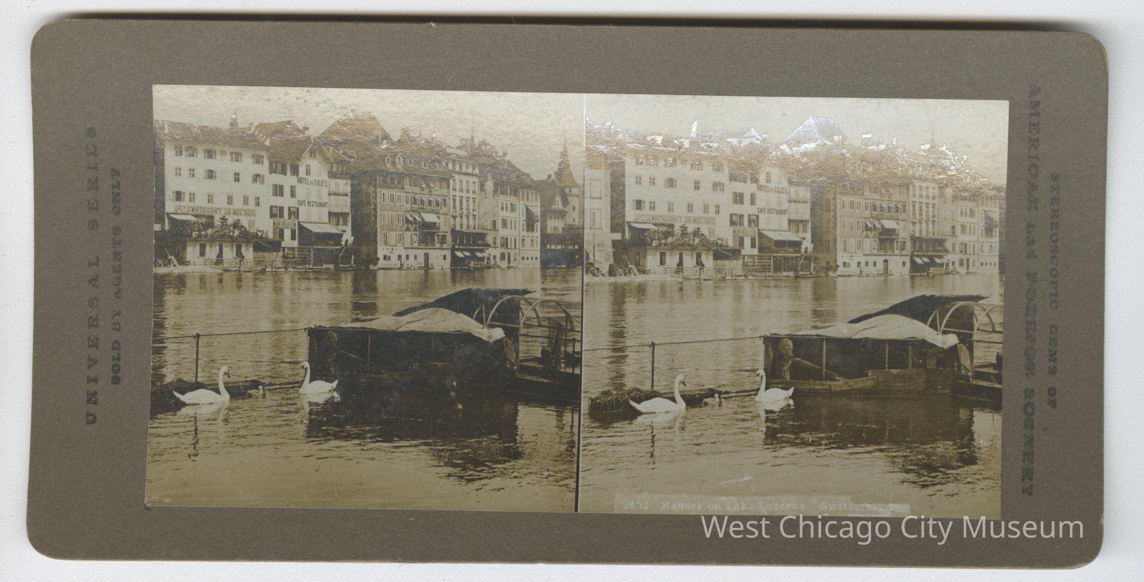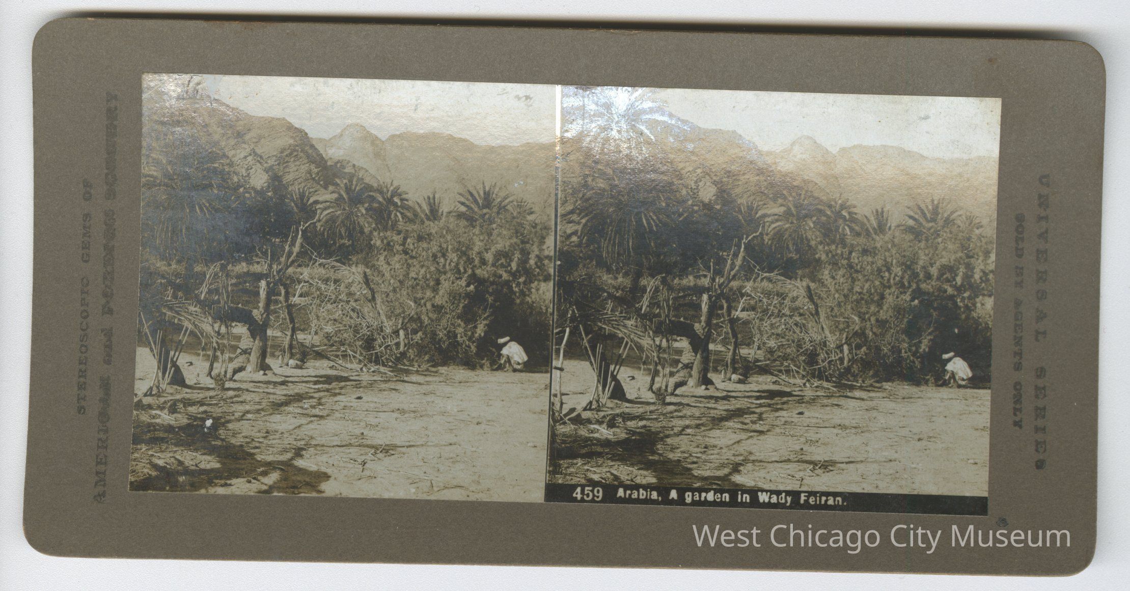 Stereoscope cards (Stereographs), Black and white, entitle "Stereoscopic gems of America and Forgiven Scenery". Cards are grouped by location / topic. They show picturesque scenes around the world and domestic life a – “3218 Amusing the baby” b – “4806 Jamaica, Brookline Street, Port Antonio” c – “3231 A Scramble for Refreshment” - shows dog with puppies d – “5106 4th Ohio Infantry embarking for Puerto Rico” e – “2852 Houses on Lake Luzerne, Switzerland” f – “459 Arabia, a garden in Wady Feiran” g – “2524 Paris Trinity Church Grand Entrance”