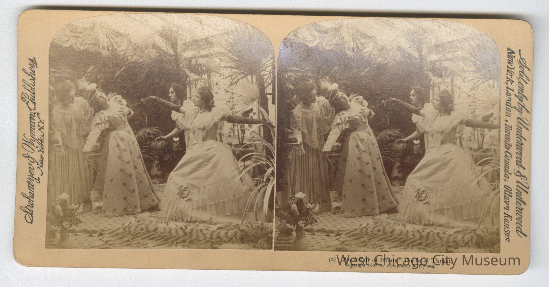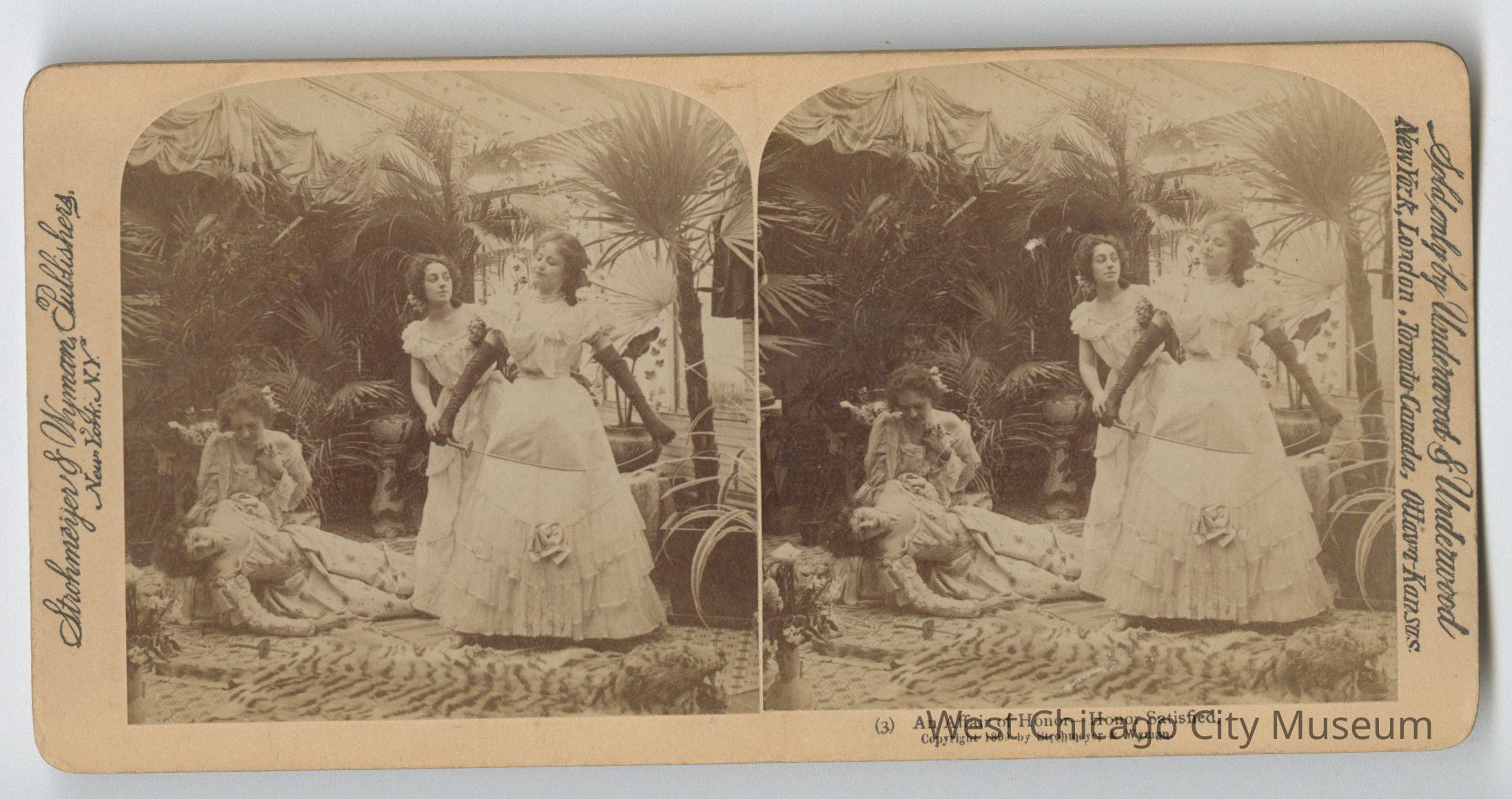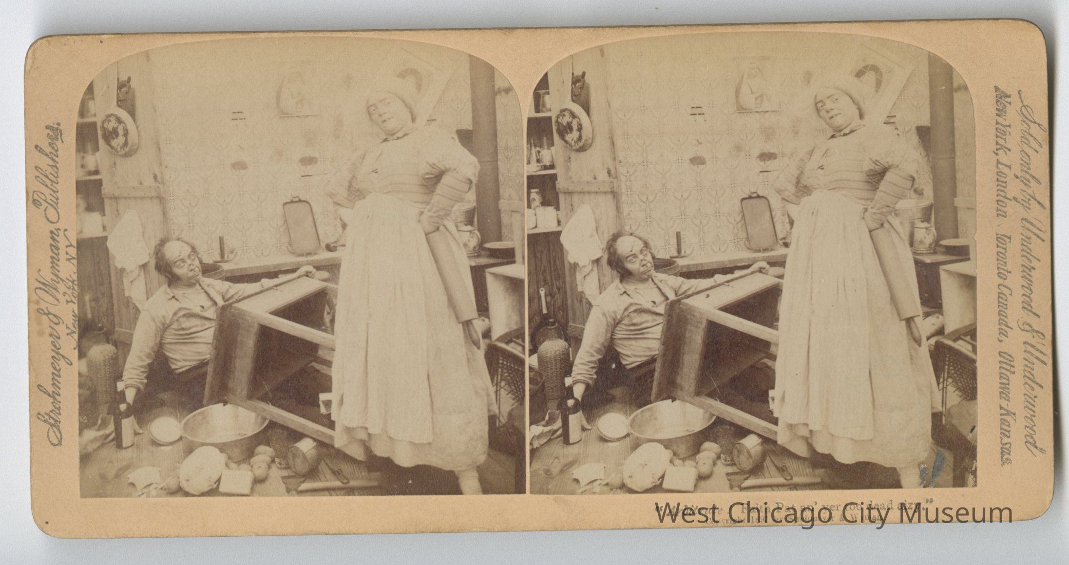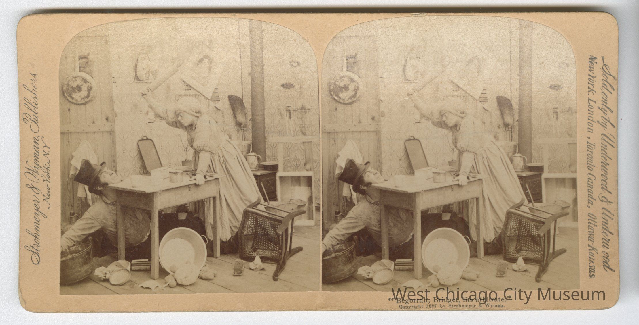 Stereoscope cards (Stereographs), Black and white, published by Strohmeyer & Wyman, and sold by Underwood & Underwood, dated from 1894 - 1899. Cards are grouped by location / topic. They show scenes from Domestic life a – “For Heaven’s sake, Maria, Give a rest!” b – “The First cloud” c – “Begorah, Bridget, lis arbitrate” d – “Arbitrate! Faith Pat an’ yer too dead airy” e – “This parting gives me pain dear” f – “When Shall we Three Meet Again?” g – “A Sad predicament – He wants to go home” h – “An Affair of Honor – are you ready?” i – “And affair of honor – the fatal thrust” j – “And affair of Honor – Honor Satisfied”