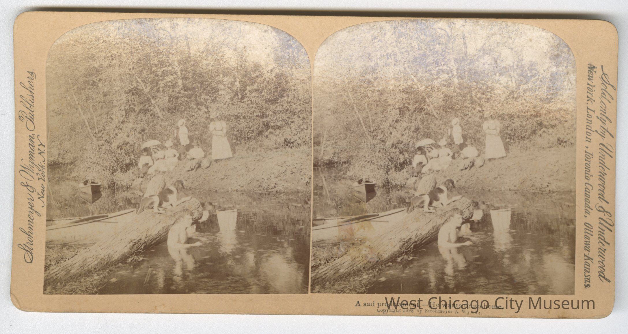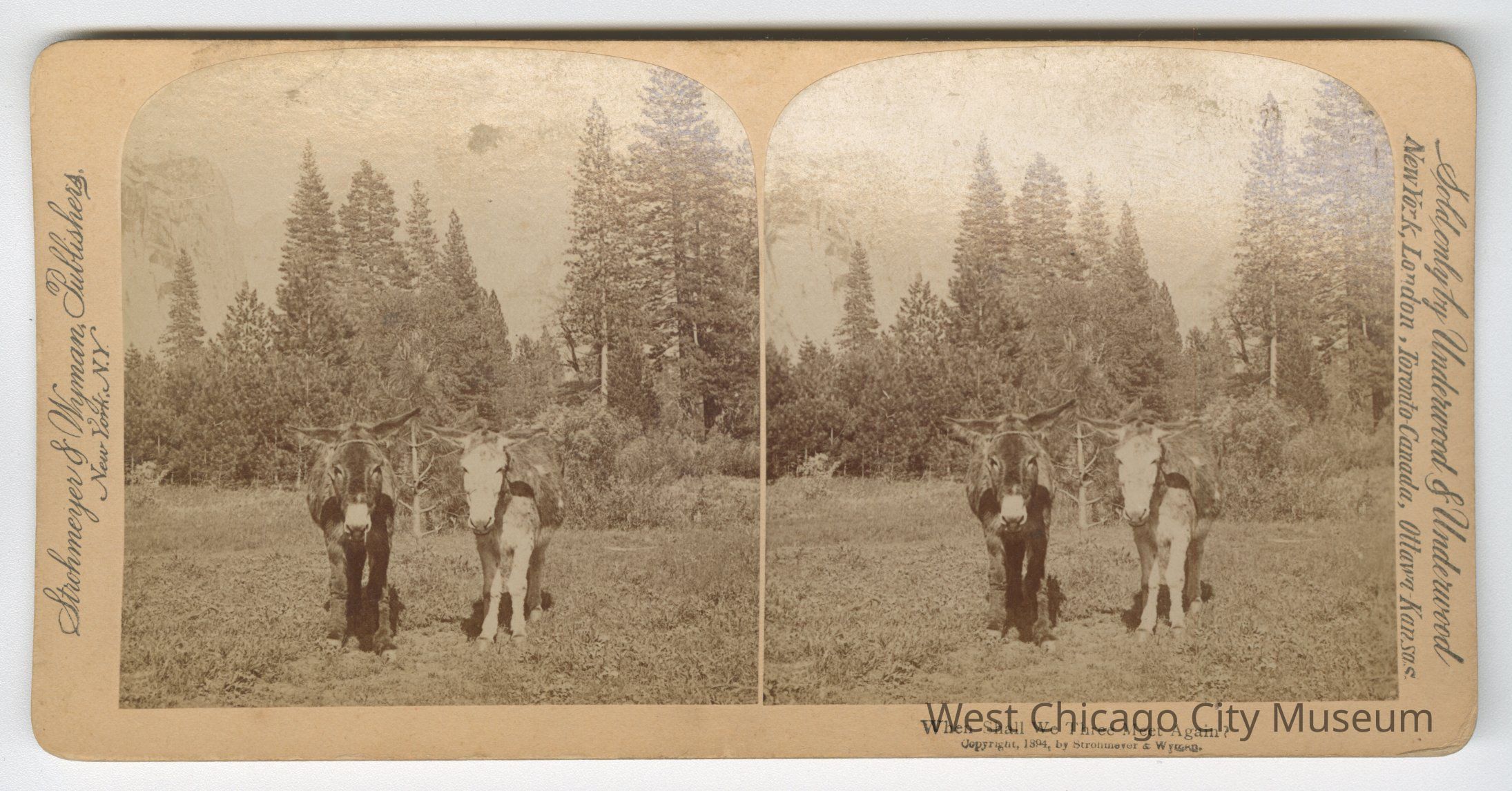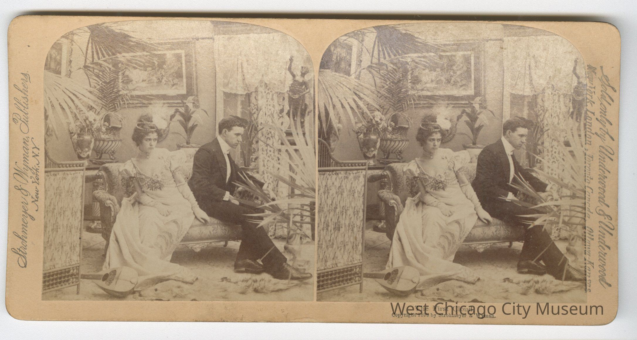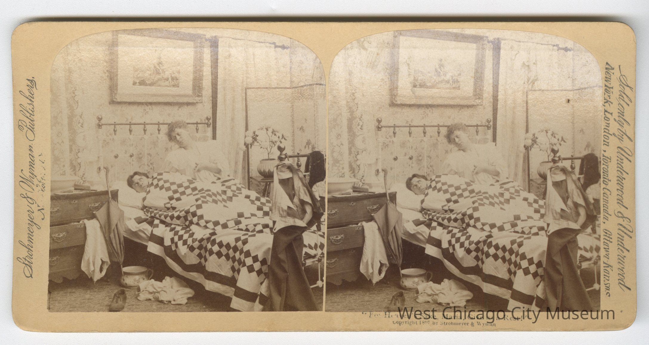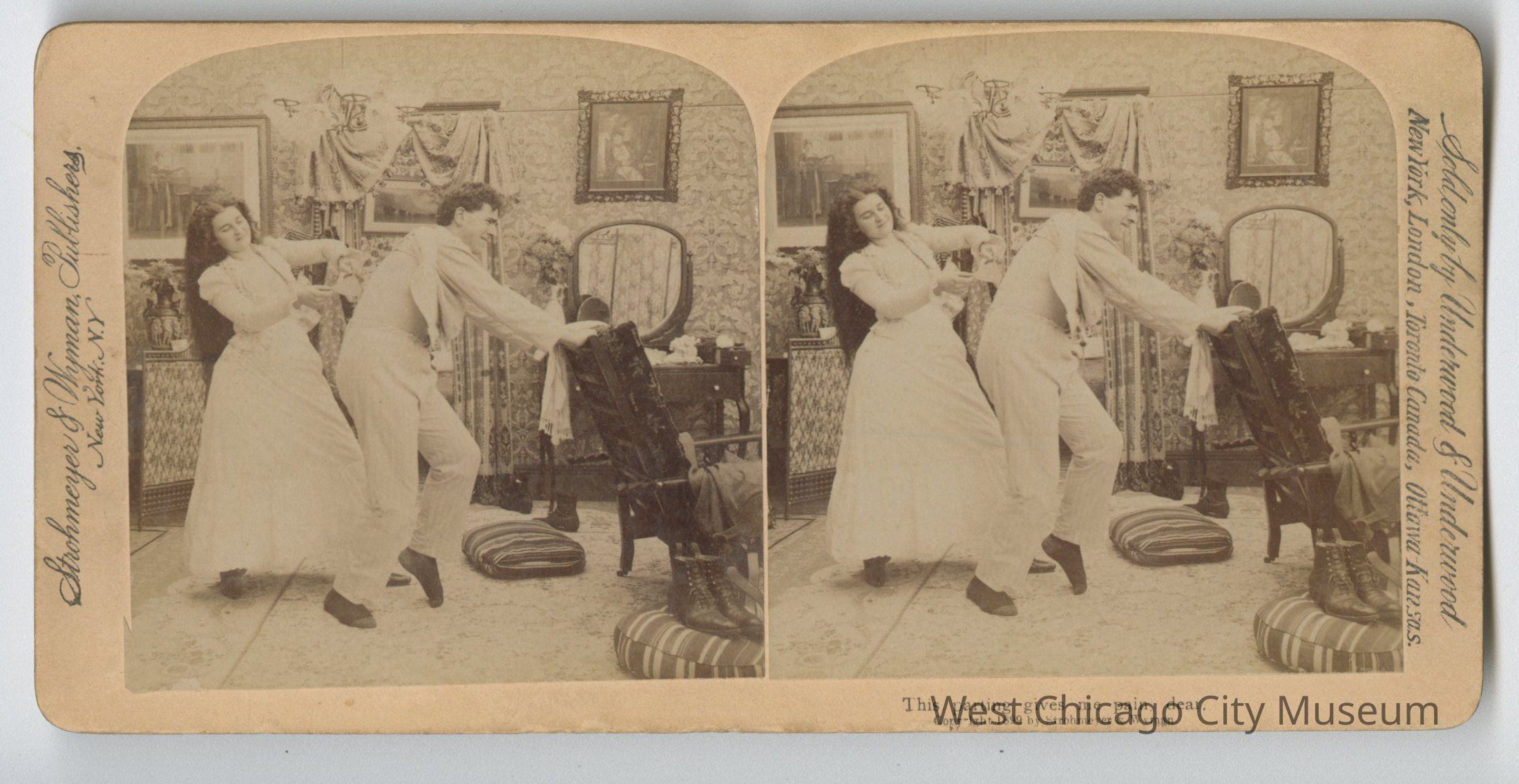 Stereoscope cards (Stereographs), Black and white, published by Strohmeyer & Wyman, and sold by Underwood & Underwood, dated from 1894 - 1899. Cards are grouped by location / topic. They show scenes from Domestic life a – “For Heaven’s sake, Maria, Give a rest!” b – “The First cloud” c – “Begorah, Bridget, lis arbitrate” d – “Arbitrate! Faith Pat an’ yer too dead airy” e – “This parting gives me pain dear” f – “When Shall we Three Meet Again?” g – “A Sad predicament – He wants to go home” h – “An Affair of Honor – are you ready?” i – “And affair of honor – the fatal thrust” j – “And affair of Honor – Honor Satisfied”