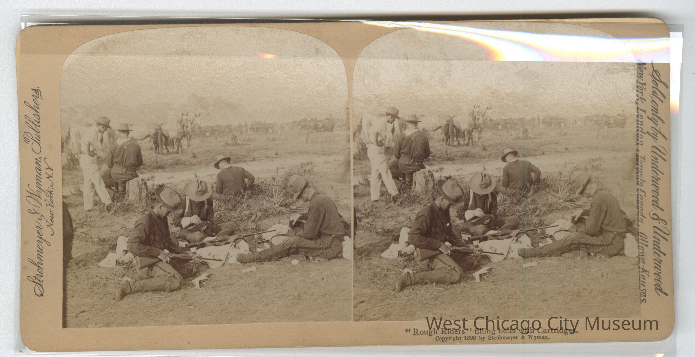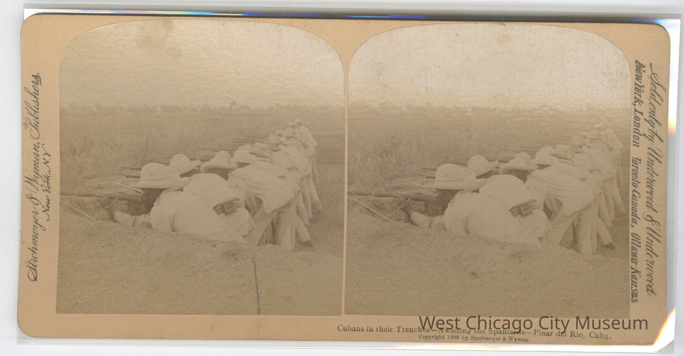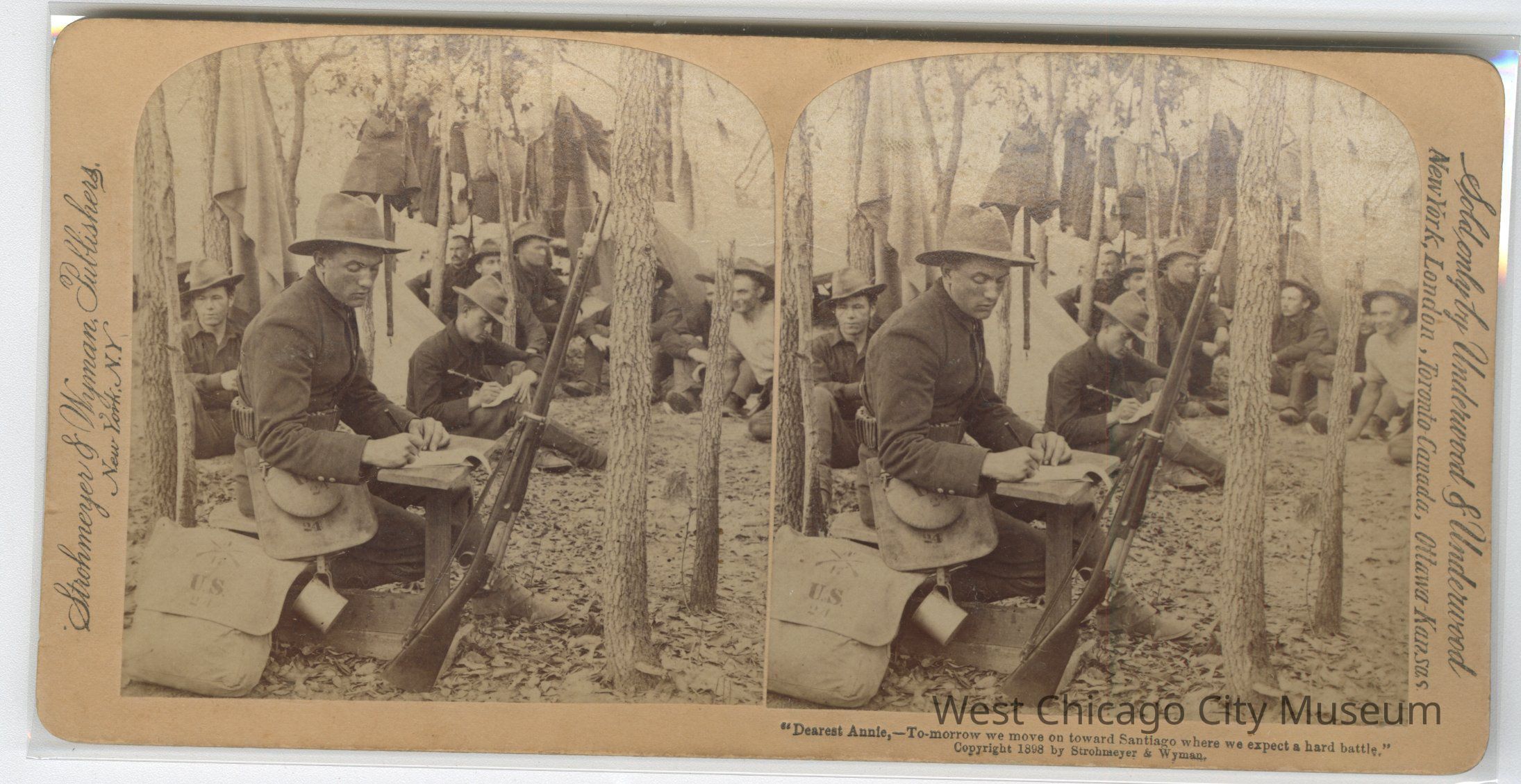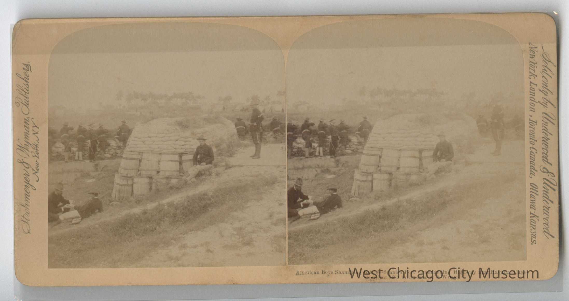 Stereoscope cards (Stereographs), Black and white, published by Strohmeyer & Wyman, and sold by Underwood & Underwood, dated from 1898 - 1899. Cards are grouped by location / topic. They show military scenes from the Spanish American War.