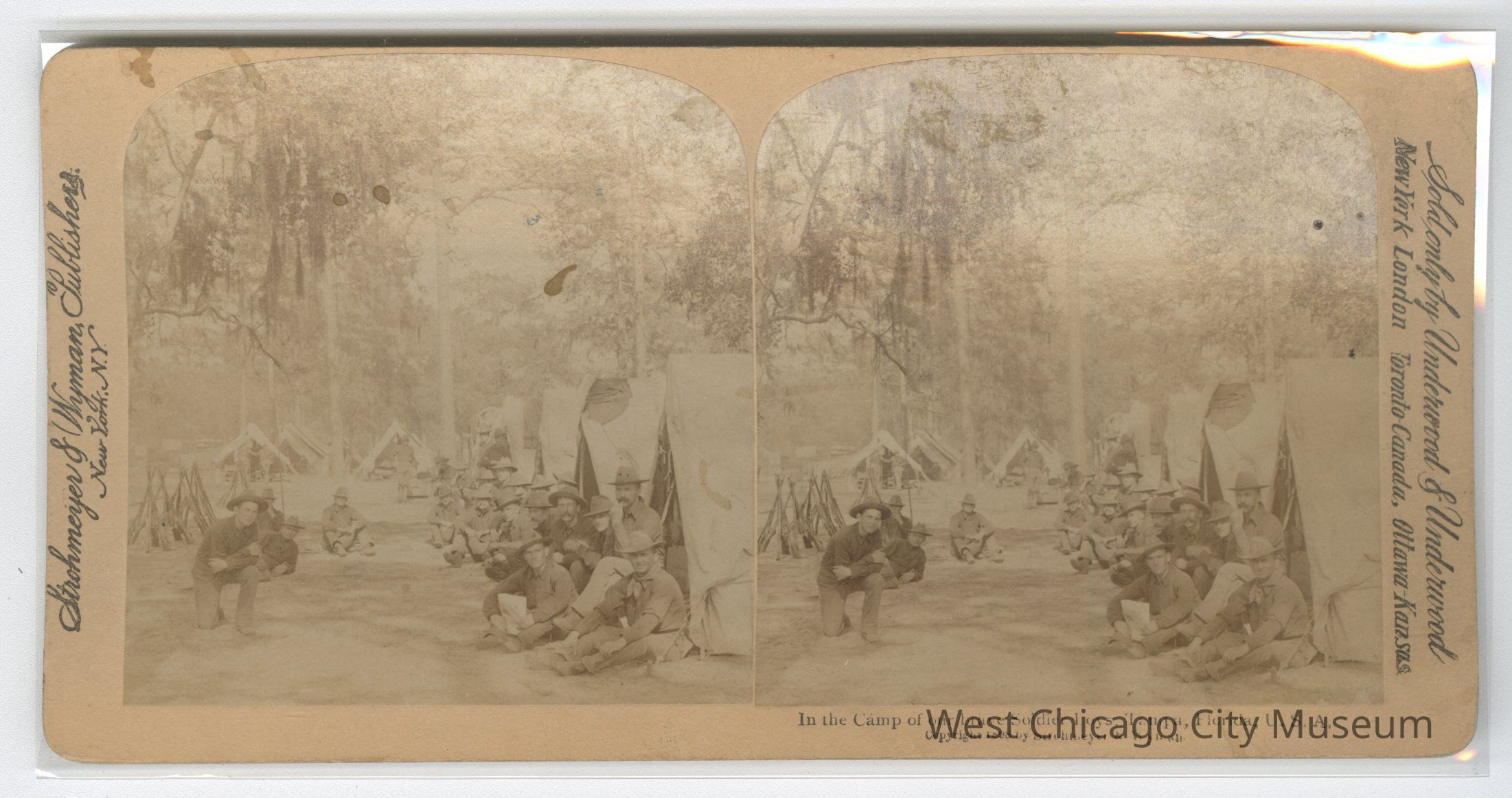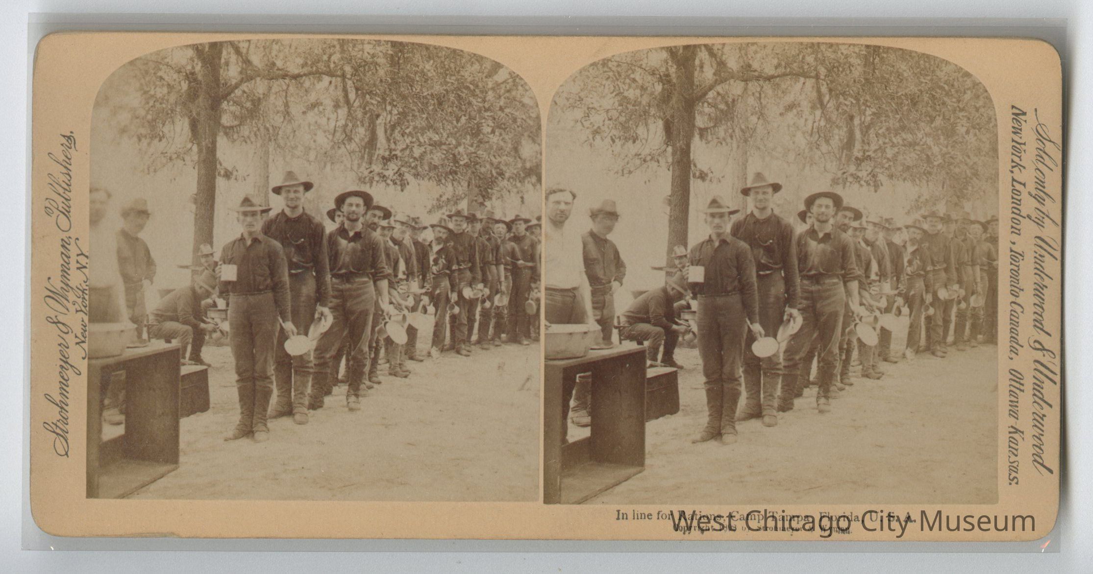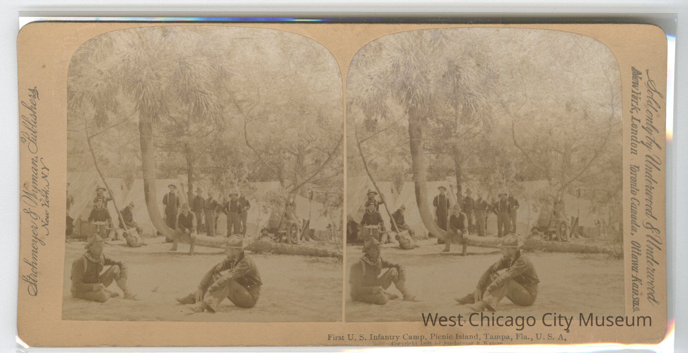 Stereoscope cards (Stereographs), Black and white, published by Strohmeyer & Wyman, and sold by Underwood & Underwood, dated from 1898 - 1899. Cards are grouped by location / topic. They show military scenes from the Spanish American War.