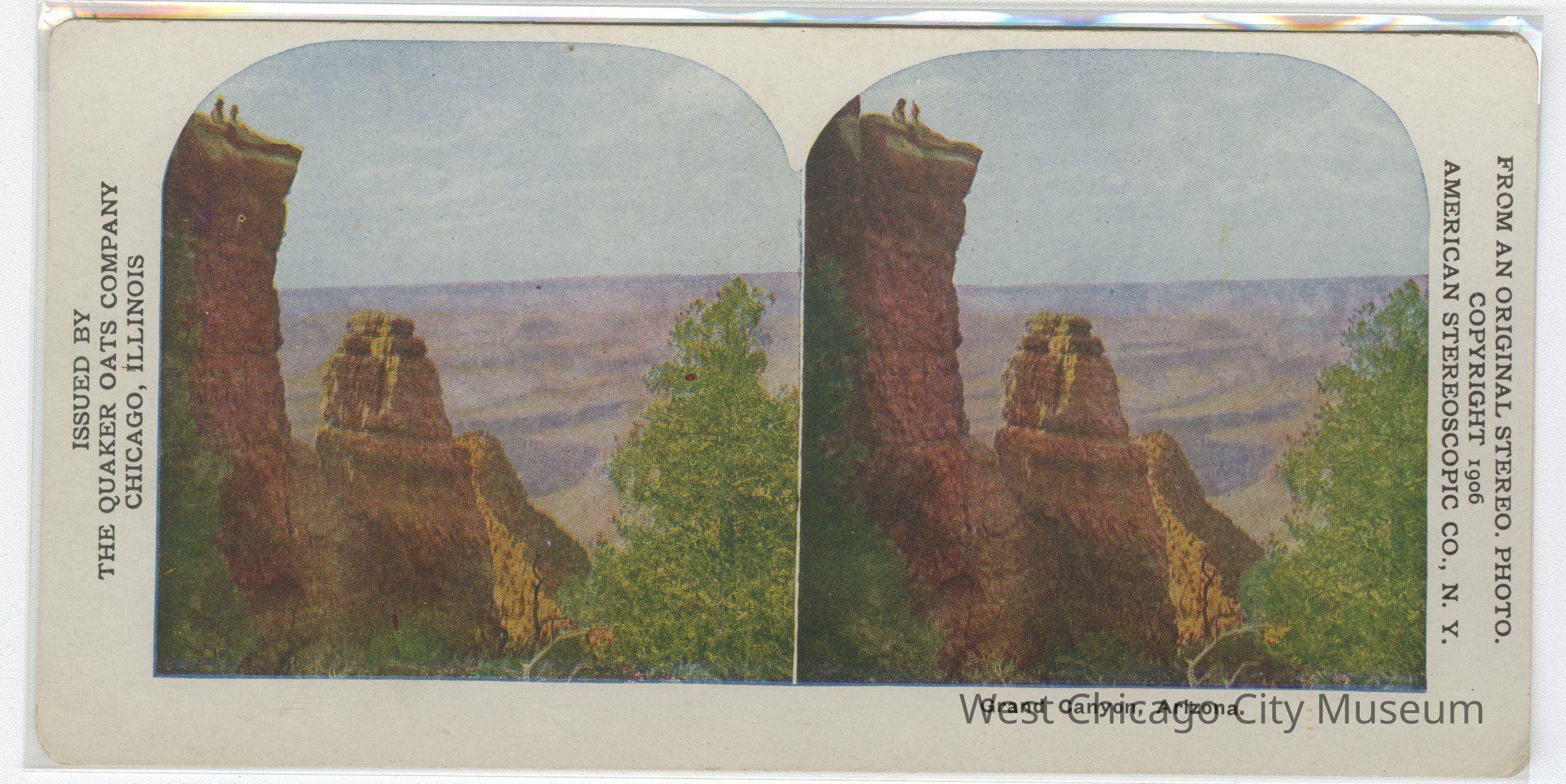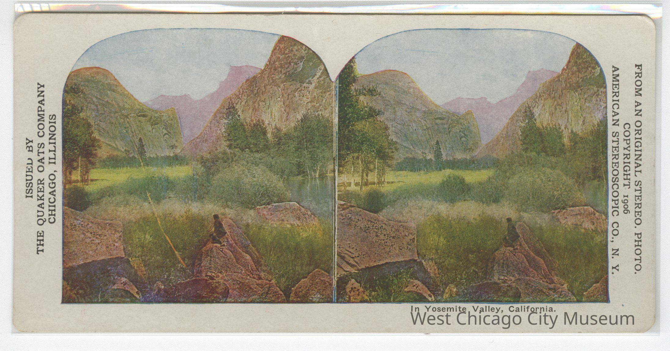 Stereoscope cards (Stereographs), full color, issued by the Quaker Oats Company, Chicago Illinois, produced by the American Stereoscopic Company, Copyright 1906. Cards are grouped by location. They show scenes of life and the landscape a- "In Yosemite Valley, California" b- "Grand Canyon, Arizona"