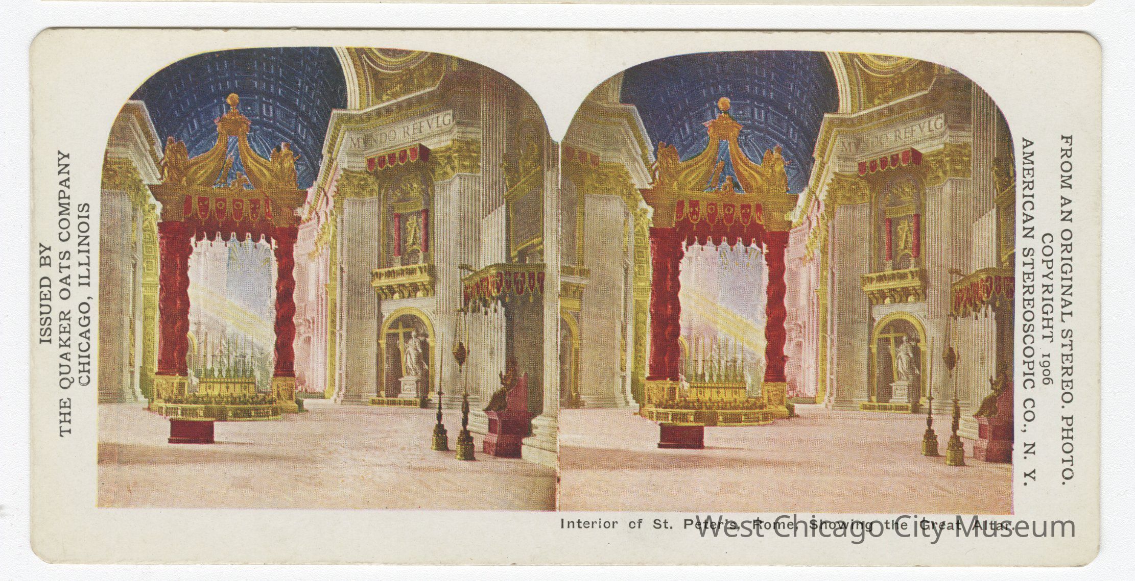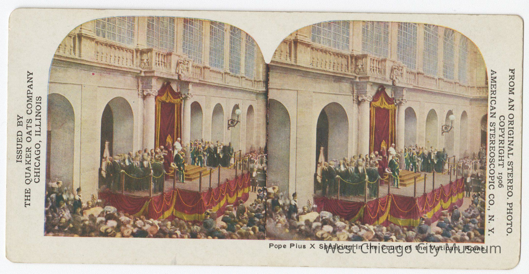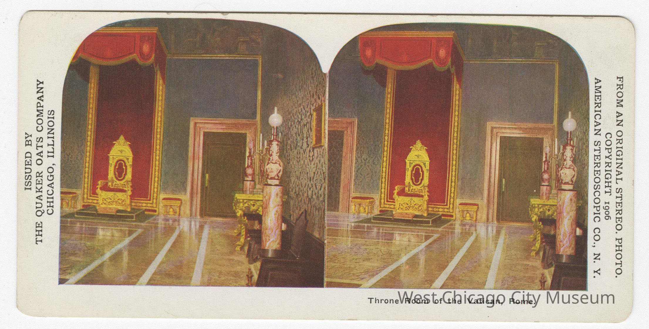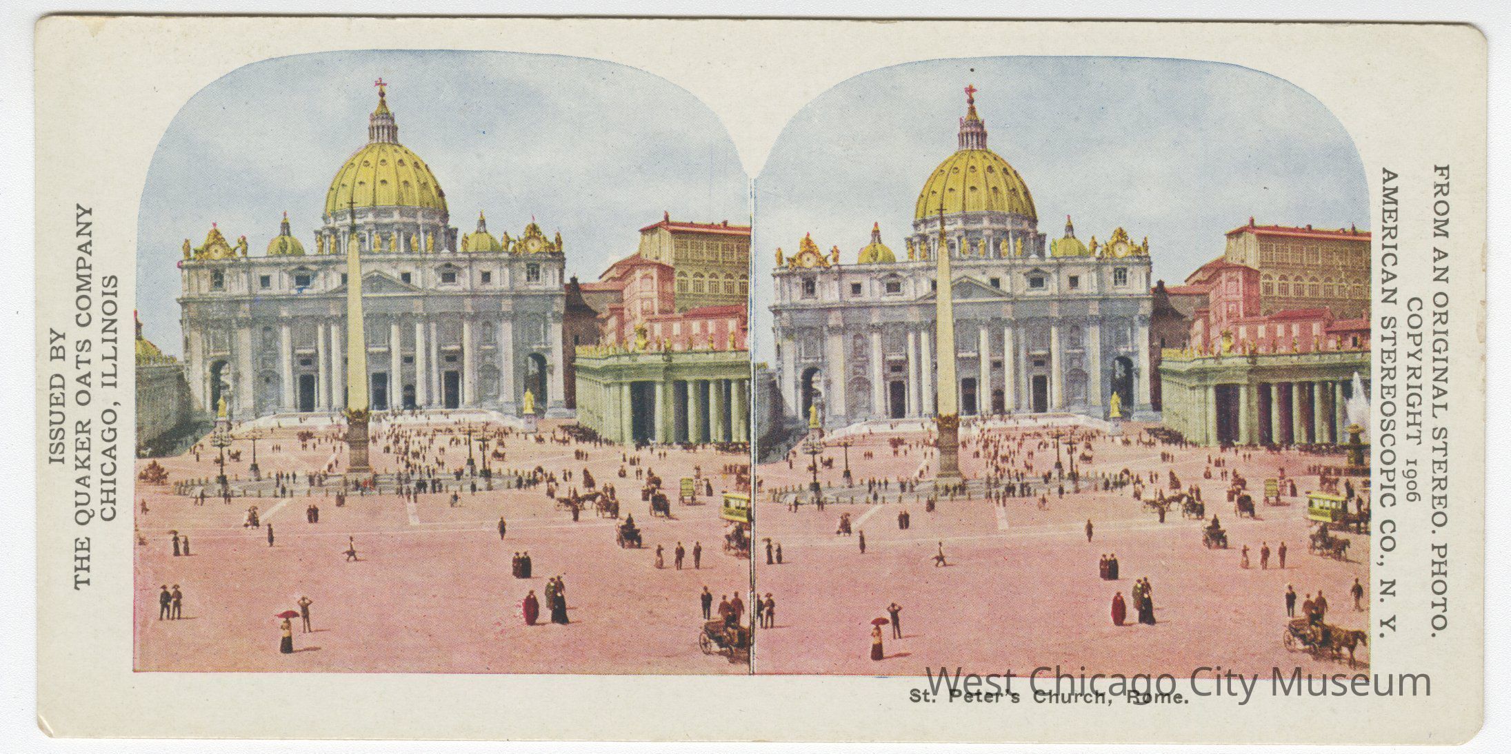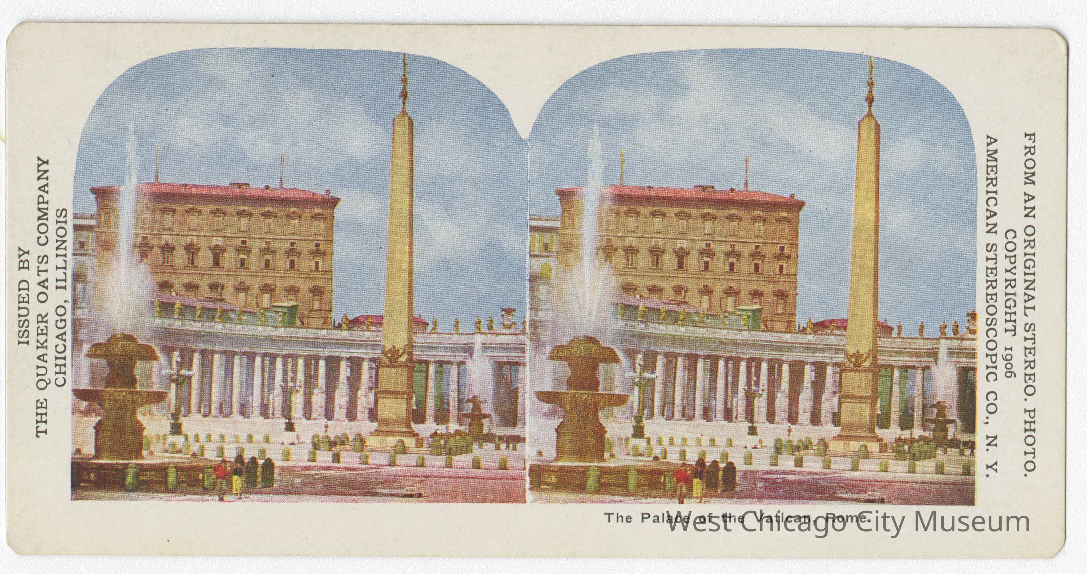 Stereoscope cards (Stereographs), full color, issued by the Quaker Oats Company, Chicago Illinois, produced by the American Stereoscopic Company, Copyright 1906. Cards are grouped by location. They show scenes of life and the landscape