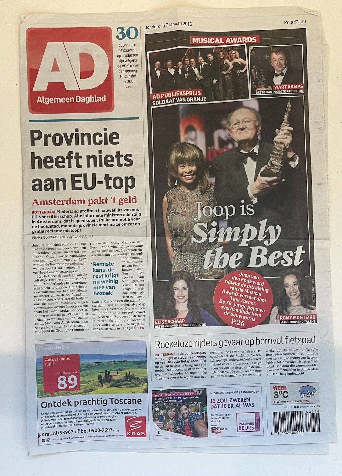 This newspaper article by Dutch newspaper Algemeen Dagblad on the producer of "TINA", Joop van den Ende winning an award.Location
