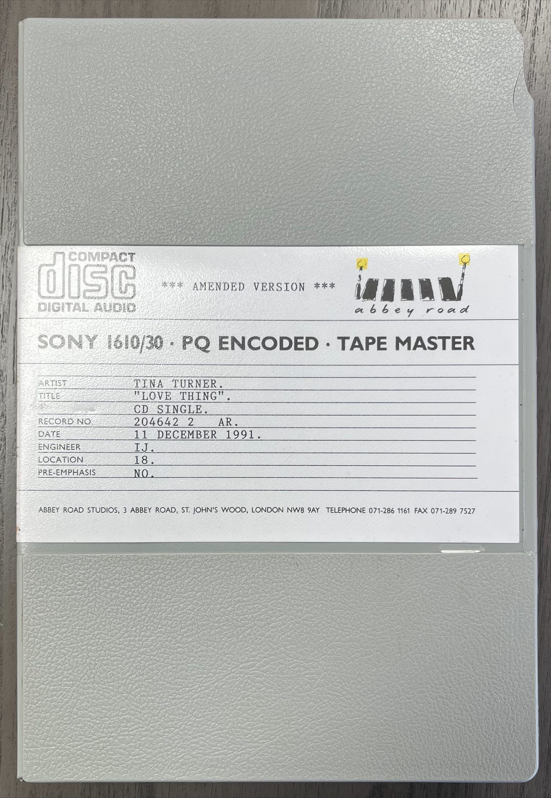 This is a master tape of Tina Turner's song "Love Thing" which was recorded in 1991 at Abbey Road Studios located in London. "Love Thing" was a single in the Tina Turner greatest hits compilation album "Simply The Best" released in 1991.