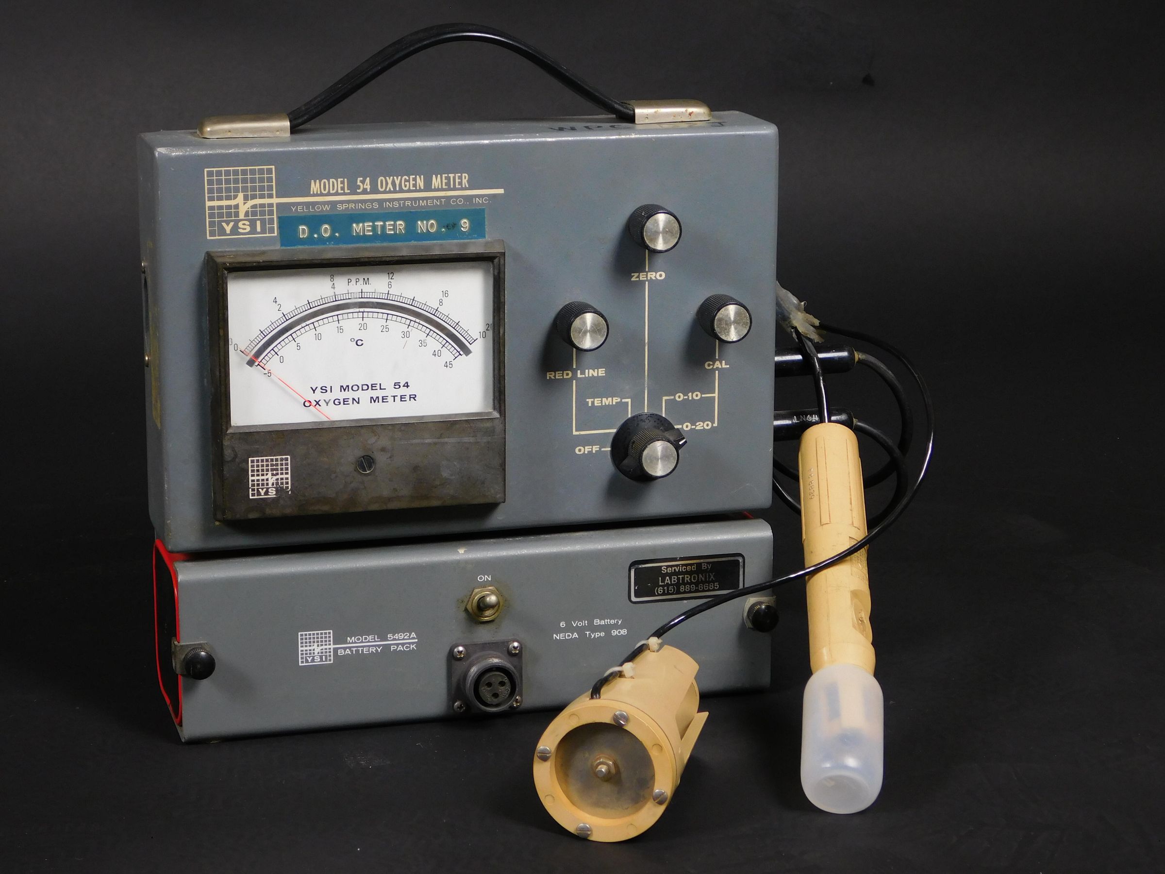 This Model 54 Oxygen Meter, produced by Yellow Spring Instrument Co., Inc., is square, gray in color, and contains four metallic adjustable dials to the right of the gauge with a thin red needle.This meter was used on the Hatchie River until the 1980s and measured the amount of oxygen dissolved in liquids. Water in lakes and rivers should have at least 5 milligrams of dissolved oxygen per liter. Lower oxygen levels stress plants and animals, and higher levels can quickly kill many of the fish. A balance of plants and animals in the water keeps the oxygen levels healthy.Location