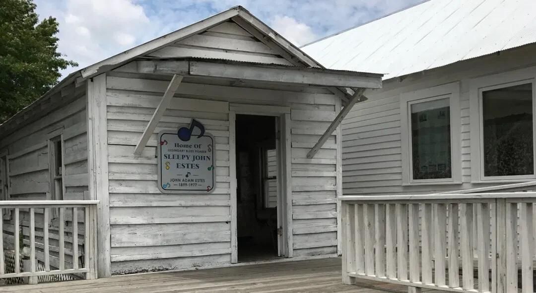 This is the last home of 'Sleepy' John Estes that he lived in before he passed away in 1977. The style of house is called a shotgun house because you could fire a shotgun through it from the front door to the back door without hitting a wall. The whole house contains only two rooms. It had electricity but no indoor plumbing. While the objects, household objects and furniture were not originally owned by Estes, they date between the early to mid-20th century and provide an accurate reconstruction of what it once looked like.