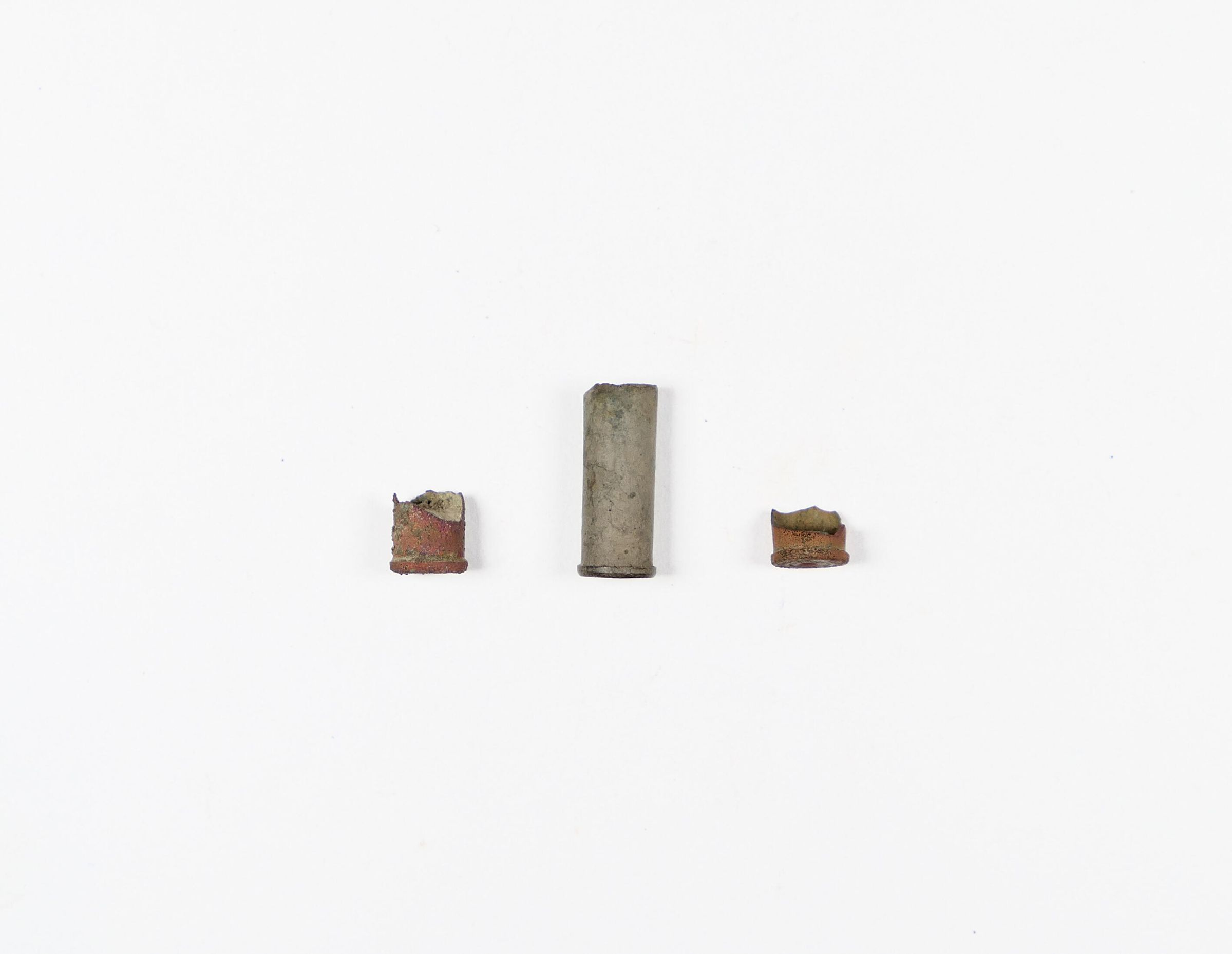 Three (3) .32 caliber S&W (or .32 S&W Short) casings, a handgun round originally for Smith & Wesson pocket revolvers.Context