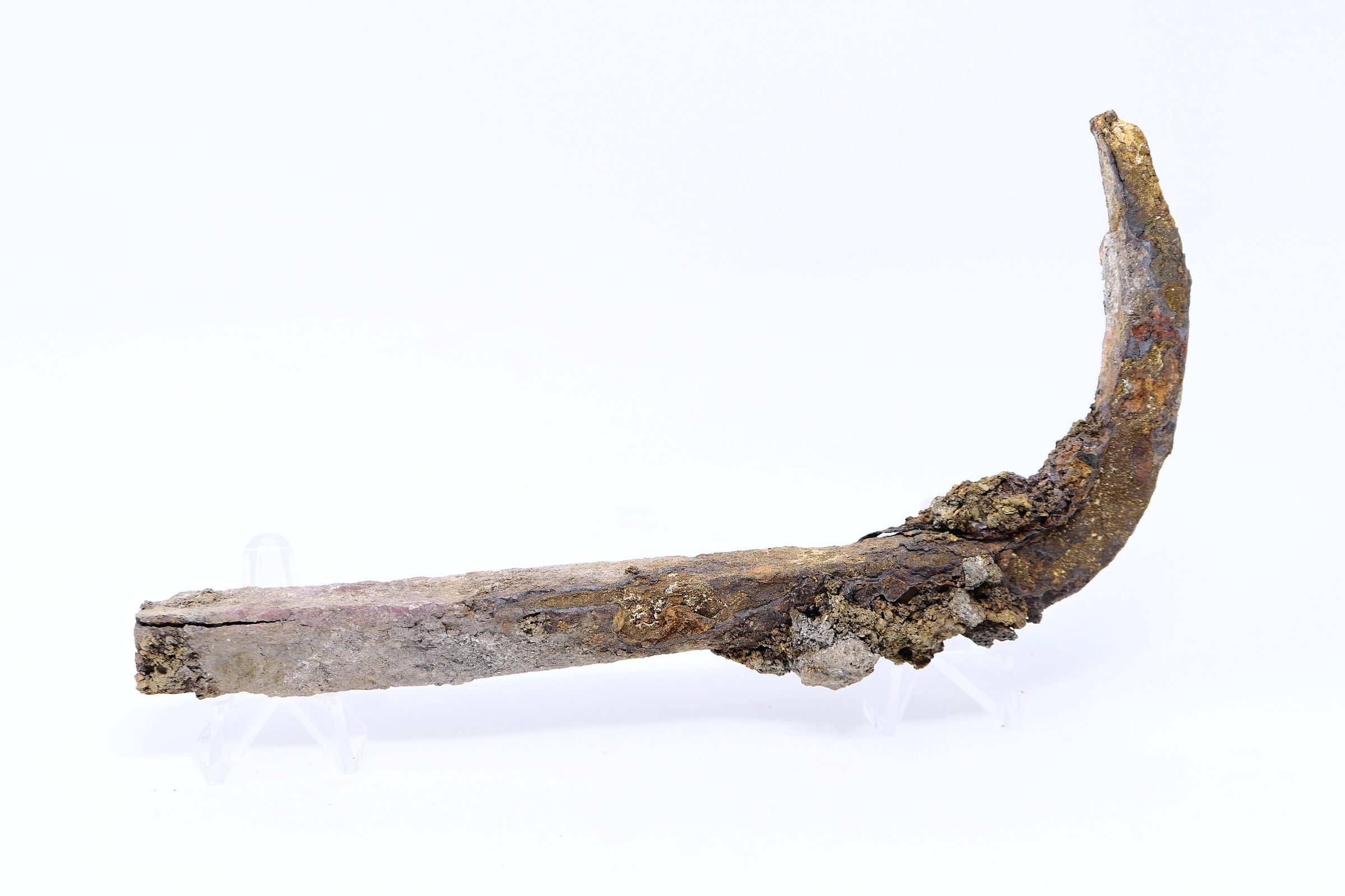 two (2) pieces of an iron fire grate, as for holding logs + multiple trace pieces of likely-related rusted metal