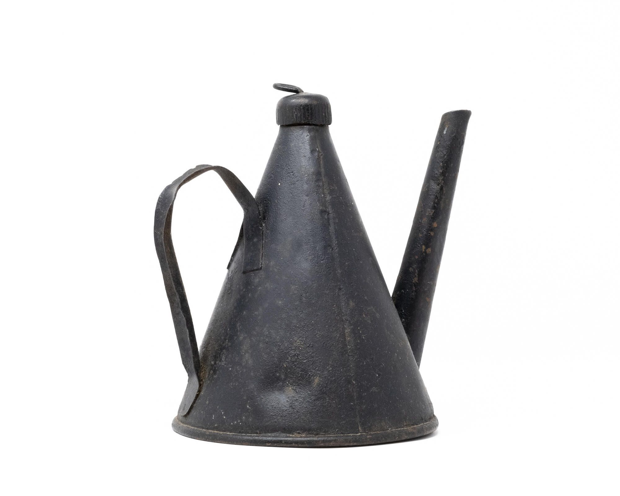 Black metal oilwick "teapot" lamp with handle. This lamp may be handmade from a tin funnel.