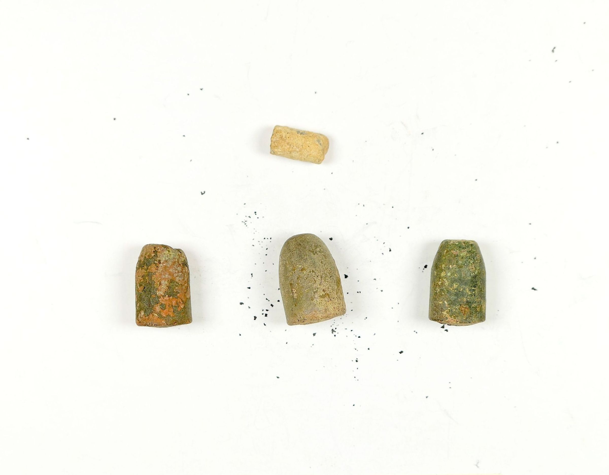 Three (3) .45ACP bullets, and one (1) probable .22 bullet, collected on White's Trace Ridge on Saturday, August 3, 2024 by Pete Alburtus and Gordon Andrews.Collection
