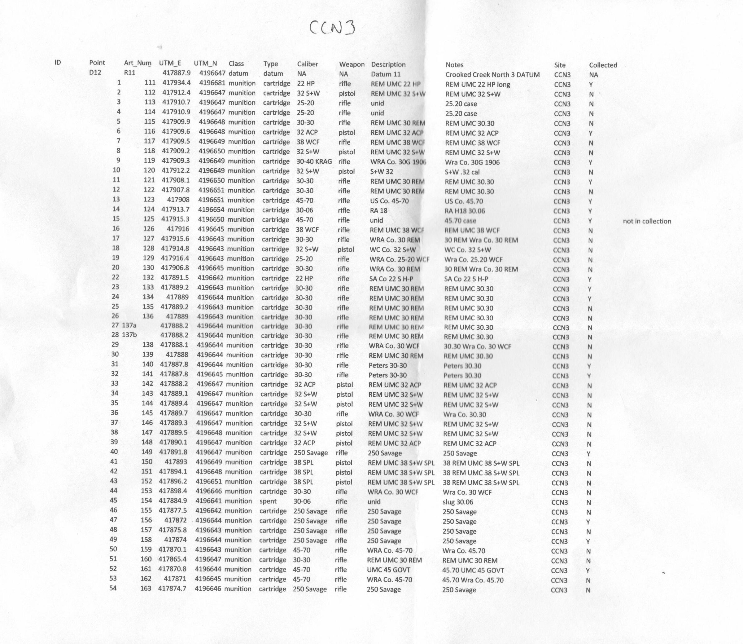 Fifteen (15) items are in this collection, from a total of 53 collected at this site. Analysis of the total collection indicates a range of calibers that suggests a long-range fire position was established here as a defensive site.